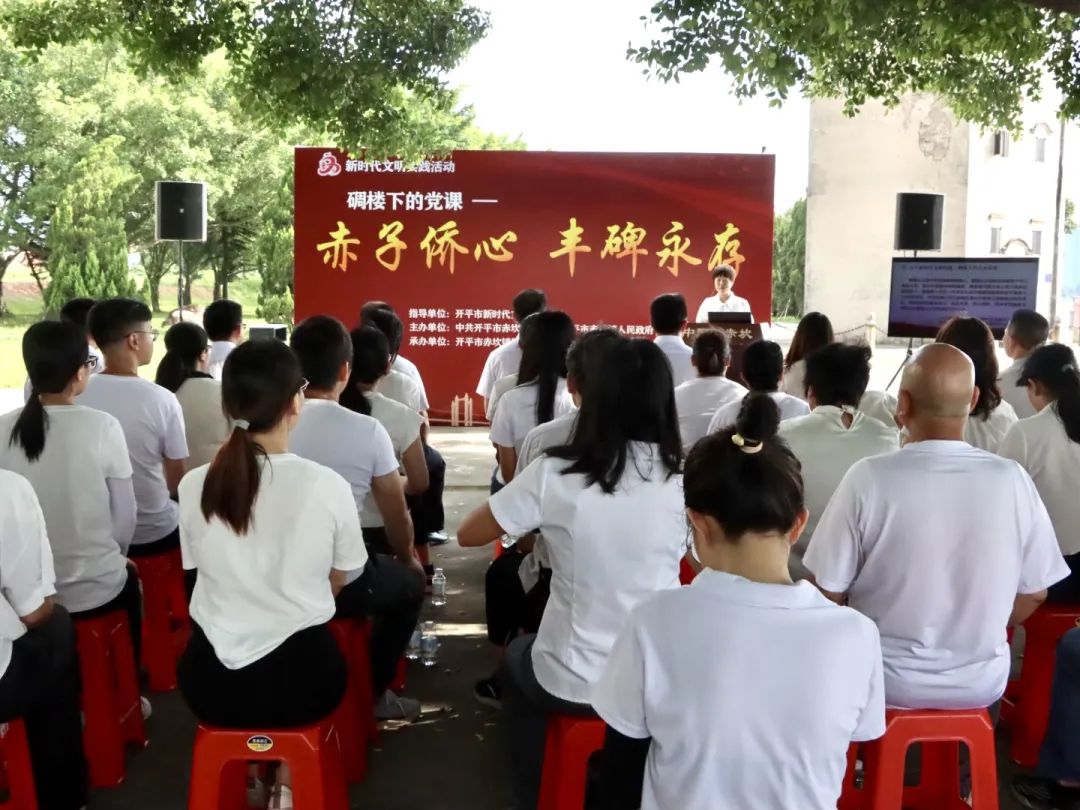 新时代文明实践“碉楼下的艺术党课”志愿服务队成员李琪以开平历史名人、革命烈士为切入点,向在场党员干部详细讲解了与《义勇军进行曲》有密切联系的司徒慧敏、为革命事业英勇牺牲的南楼七烈士的英雄故事,串起了开平爱国华侨在中国共产党领导下为中国人民谋幸福、为中华民族谋复兴的奋斗历史,为在场党员干部带来了一场精彩的文化盛宴。 ” 党员干部课后纷纷表示在课堂上感悟初心使命,汲取奋进力量,受益匪浅,日后将以永不懈怠的精神状态和昂扬向上的奋斗姿态,走好新的赶考之路,推动赤坎经济社会高质量发展。 活动中,党员干部们还肃立默哀,缅怀“南楼七烈士”并献上了鲜花,继承英烈遗志,弘扬英烈精神。