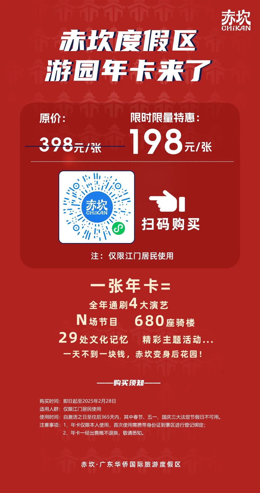 购买时间:即日起至2025年3月31日; 使用时间:即日起至2025年3月31日; 儿童使用标准:身高1.2-1.5米(含)或16周岁(含)以下。 节后还能看什么?玩什么? 年卡到底值不值?请看—— 刚刚过去的春节 赤坎再登央视、全网刷屏 从年初一火到年初七 节后的赤坎,又将是另一种体验—— 看剧不用排队,拍照不用避人群 从街头吃到巷尾,慢逛细赏每座骑楼 如留宿骑楼酒店,一不小心还能包园 一张年卡能带你去看—— 归途 The Return 百年赤坎变迁简史,万千华侨荣光再现 给赤坎50分钟,还你一个黄金时代。 火秀 fire show 富有盛誉的王牌演艺 打铁花、烟花、舞火龙一次看到爽! 摩登时代 Modern Times 景区唯一纯西式歌舞表演 全程高能狂欢的海上百老汇 特别的婚礼 Speciel Wedding 回到赤坎的每个人 都是这场特别的婚礼的证婚人 从骑楼下到江畔,随时随地能入戏 在《南楼!南楼!》看英雄历史 在《豪门有戏》加入1926的歌舞派对 都看过了?没关系! 正在上映的演艺会不断进化 可能每一次都会发现新细节! 今年还有新剧登台吗? 嘘——敬请期待。 去年的赤坎怪诞夜、奇妙童话夜 多次出圈,连续数月引爆社媒 今年还会有哪些精彩活动呢? 悄悄剧透—— 人气NPC返场、新顶流上线 超出片打卡地、烟花派对…… 情人节与元宵节活动即将上线 还有清明节、复活节、端午节 暑期嘉年华、万圣、圣诞…… 敬请期待~ 灵通电话公司、发明电灯公司 关光裕碉楼、灵通电话公司… 680多座骑楼,29处文化记忆 带你亲历黄金年代! 是的,今年赤坎玩法更丰富了 鬼屋、密室逃脱 儿童乐园、非遗手作 特色文创、本地美食 雾海游船、主题铛铛车 奇幻夜景、节日美陈、中西换装… 应有尽有,还没有的也在路上了 01 198元买年卡划算吗? 门票单价为150元,即第二次入园为3.2折,第三次玩开始无限免费,属于应玩尽玩、大薅特薅! 02 只有江门人才能买年卡吗?特惠价到什么时候呀? (1)目前年卡使用对象仅限江门地区居民,每人限购一张; (2)特惠年卡购买时间:即日起至2025年2月28日; (3)年卡一经激活概不退换,敬请悉知。 03 如何购买年卡呀? (1)在购票处现场购买; (2)点击年卡进入小程序,再点击「票务」-「门票年卡」购买; (3)在抖音、美团、携程等官方线上店铺购买; 04 买了之后如何使用? 购买年卡后,首次使用需进行激活人脸识别;拥有江门地区身份证的居民可携带本人身份证前来景区售票中心办理激活;如拥有江门地区在住户口或暂住证的居民,亦可携带本人户口本+本人身份证/本人暂住证+本人身份证到景区售票中心进行登记个人信息办理激活,激活后以人脸识别的方式入园游玩。 05 年卡使用时间有限制吗? 激活期限:2025年4月30日21:30前,超过期限仍未激活则无法再使用; 使用期限:自激活日起至往后365天内; 不适用日期:三大法定节假日不可使用:劳动节(2025.5.1-5.4)与国庆(2025.10.1-10.7)、春节(2026.2.17-2.24) 06 小朋友有年卡优惠吗? 1.2米以下的小朋友是免票进入景区滴,高于1.2米的小朋友就要像大朋友一样购买年卡啦。 07 年卡可以给别人用吗? 不可以哦,年卡使用方式为人脸识别入园,仅限本人使用~ 一天不到一块钱,赤坎变身后花园! 工作累了,进来散散步 躺无聊了,进来看看剧 不高兴了,进来坐在江边发个呆 想不到晚饭吃什么,进来随便选 朋友圈不知道发啥,欢迎四季都来打卡
