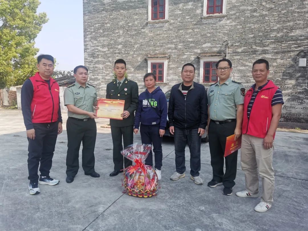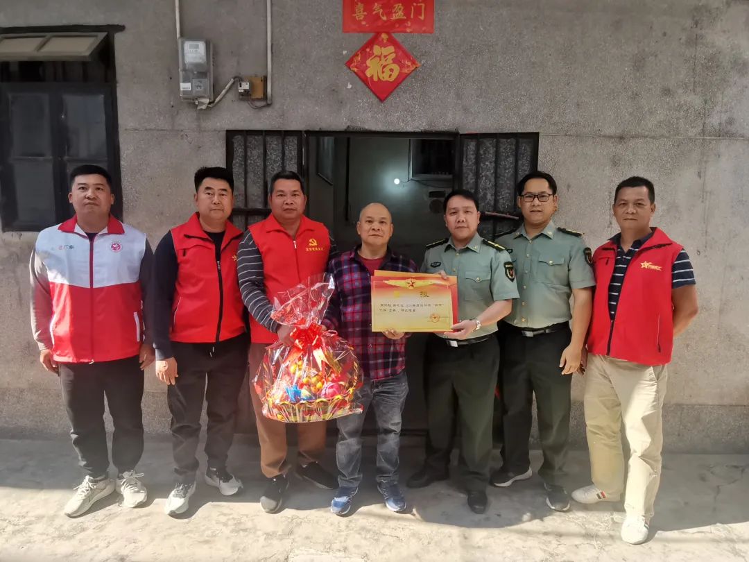 近日,赤坎镇武装部、退役军人服务站和村委会共同为在部队荣获“四有”优秀士兵家庭送上立功喜报和慰问品,营造“一人参军,全家光荣”的社会氛围,及时传递镇党委、政府对军人家属的深切关怀与崇高敬意。赤坎镇党委副书记、武装部部长谭永健带队参加活动。
