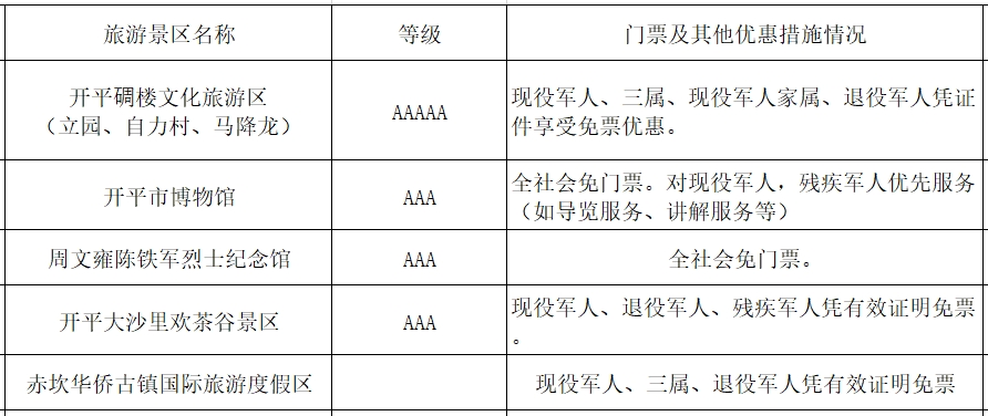 近年,海棠直播 大力建设“邑美侨乡·世遗风韵”乡村振兴示范带,加快推进“梦回开平·华海侨韵”夜经济项目建设运营落地,科农文旅深度融合,优待政策日益丰富。据统计,全市共有5家A级以上景区面向全国退役军人和其他优抚对象提供优待服务,希望吸引全国战友到开平全域旅游。赤坎古镇工作人员表示:“我们景区很荣幸能够接待来自全国五湖四海的老兵,门票虽然免费,但服务绝对不打折扣。”