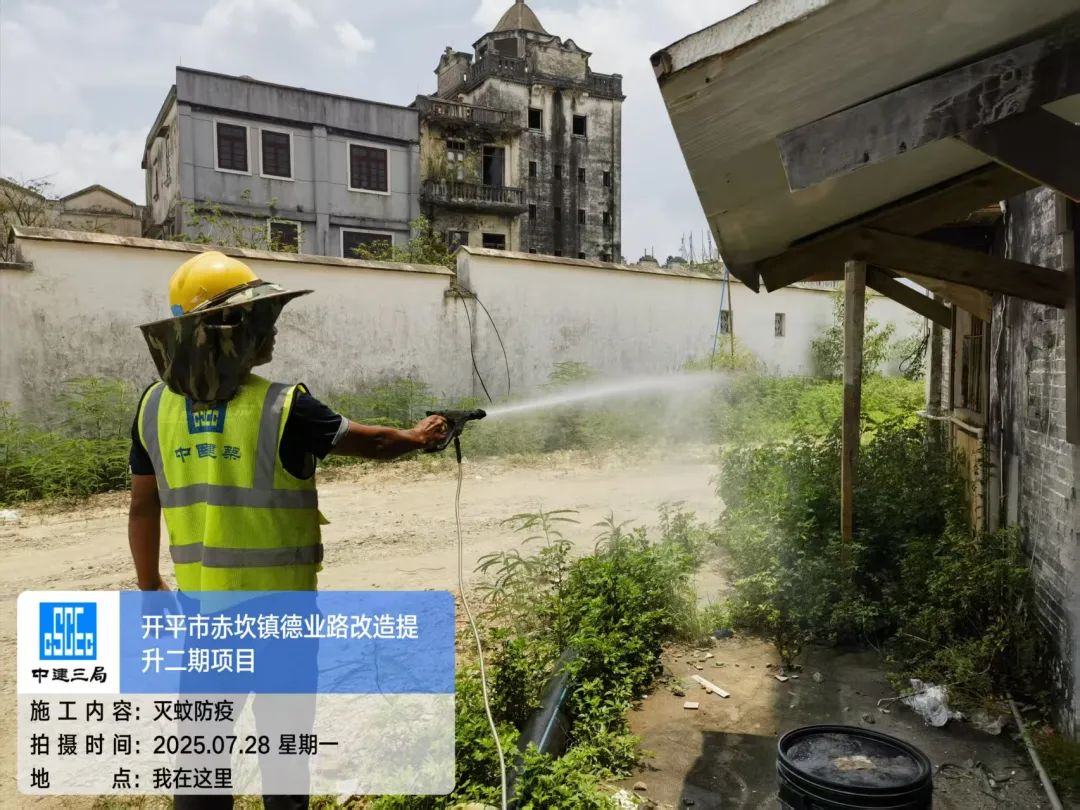 赤坎镇德业路改造提升二期项目建筑工地周边全面消杀灭蚊 三、开展环境卫生整治 深入组织镇村干部开展环境卫生整治,清理房前屋后垃圾杂物,翻盘倒罐清理积水(尤其注意清理雨天后废弃瓦罐、泡沫箱、饭盒和废弃轮胎的积水),喷药消杀灭蚊。