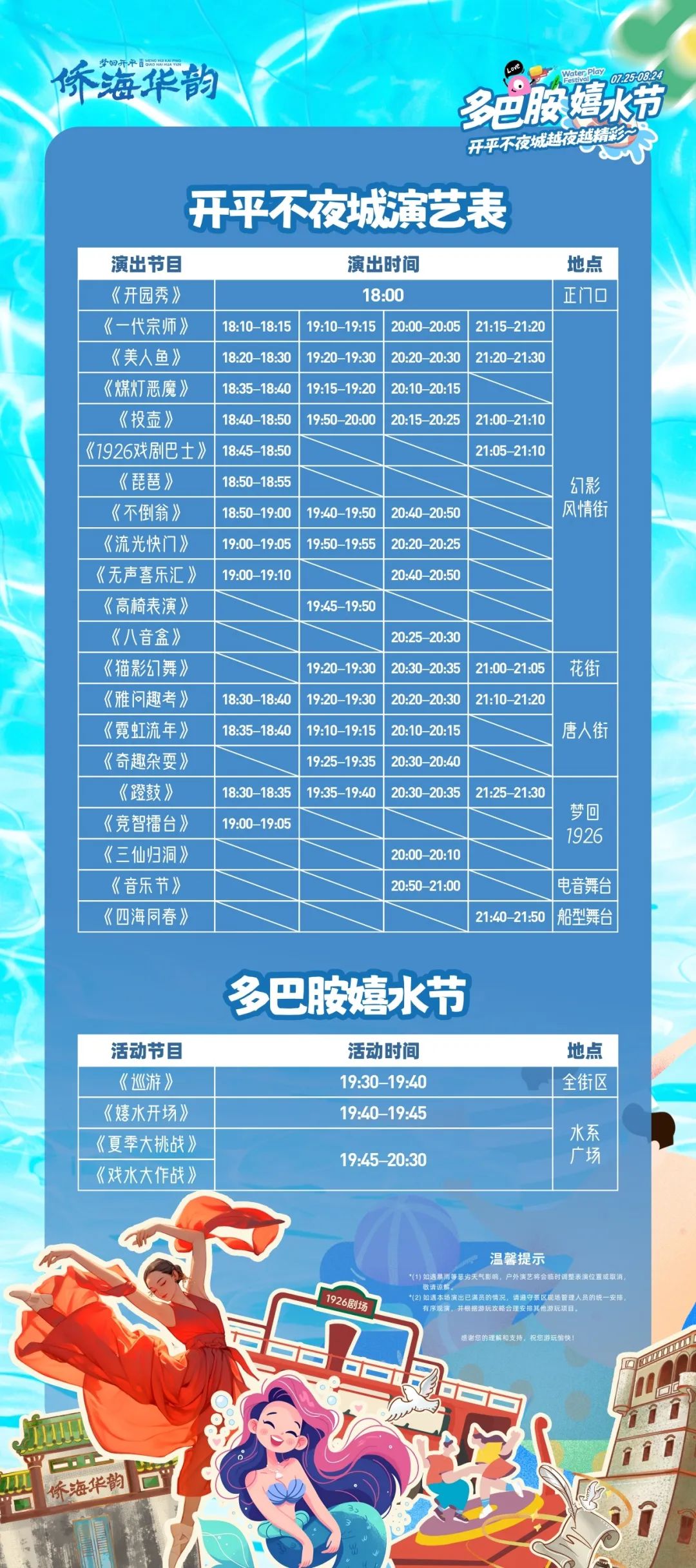 嬉水巡游 发动热浪反弹的超级大招 水花瞬间在开平不夜城的每一寸快乐空间炸开 三伏天?全部都弹走! 戏水大作战 甩开酷热三伏天 “通缉40 ℃”的热浪大战一触即发!!! 灵活穿梭在五彩的水枪射线中 一秒击走全身热量 泡沫奇遇 装载了满满的多巴胺 终于可以放下大人的包袱,跌进反重力泡泡云 泡泡炸开瞬间,童真的小旋风铺面而来 电音狂欢 灯光和音响已就绪 一起来锁定舞台、统治舞池! 随着节奏摇摆 迎接音浪风暴吧~ 开园秀 唤醒快乐的色彩,引爆快乐因子! 酣畅淋漓的欢迎舞率先拉满你的情绪 热情四射,欢乐得让人尖叫~ 胖胖美人鱼 今夏的开平不夜城论谁最抢眼? 当然是白白胖胖又逗趣的网红美人鱼了~ 来个气泡比心,再来个隔空飞吻 可爱满分! 八音盒 真人版八音盒故事上演 你猜是魔术师操纵着洋娃娃 还是洋娃娃控制了魔术师? 夜幕中,引你进入神秘世界…… 音乐节 超强劲音浪和心脏共振 “砰砰”心跳声是自带的混响 多巴胺直线飙升,尖叫才是唯一的解药! 四海同春 重头戏绝不能错过~ 磅礴宏伟的大船之上 正上演一场赤坎的百年古埠传奇 磅礴如虹,向你述说岁月的故事 50+中外精彩好戏连台 谁说现实没有时光机? 王牌演绎,50+中外好戏不容错过 《1926戏剧巴士》《一代宗师》《不倒翁》 《投壶》《霓虹流年》…… 游走在不同的主题风情街道 让您完全融入每一个精彩年代 10+项游乐设施放肆开玩 碰碰车、飞椅、海盗船、无轨小火车 还有玻璃高台滑行的高台滑水道! 10+款趣味机动游戏,让心跳加速 把酷暑远远甩掉~ 玩累了?直接奔进美食天堂! 冰淇淋、暴打柠檬茶、冰爽酸梅汤…… 放肆吃喝无压力 开平不夜城·开心大舞台新玩法上线! 爱表演爱舞台的你,请速速来报名! 全场尖叫声只为你! 这个夏天,来开平不夜城 赶走三伏天,一起走花路吧! 👀 演艺表 👀 不夜城精彩节目,看这张演艺表就够了! Q1:园区营业时间? 工作日:16:00-22:00/周末:11:00-23:00 Q2:入园是否免费? 是的,免票入场,演艺活动任意看,游乐设施按具体项目收费。 Q3:景区位置及停车信息? 导航至:赤坎镇崇文路33号梦回开平侨海华韵