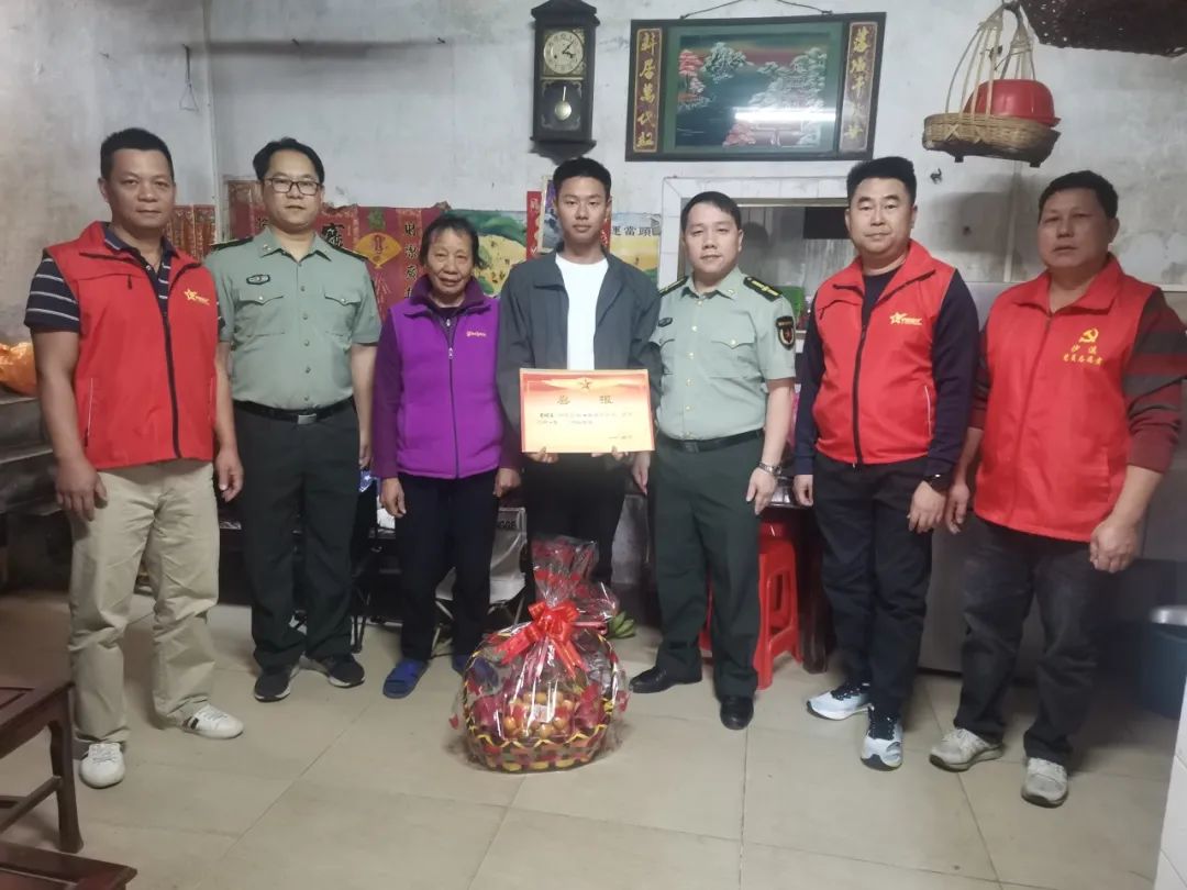 近日,赤坎镇武装部、退役军人服务站和村委会共同为在部队荣获“四有”优秀士兵家庭送上立功喜报和慰问品,营造“一人参军,全家光荣”的社会氛围,及时传递镇党委、政府对军人家属的深切关怀与崇高敬意。赤坎镇党委副书记、武装部部长谭永健带队参加活动。