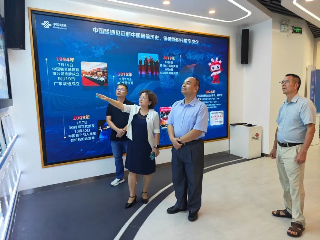 黄大勇一行首先参观了江门联通公司的职工俱乐部与5G数字化创新体验中心。在职工俱乐部,大家实地感受了企业的特色文化建设,以及企业管理中的人文关怀。在5G数字化创新体验中心,通过讲解员的细致介绍和多媒体展示,参观人员深入了解了中国联通在5G技术、数字乡村、智慧农业等领域的创新成果与实践案例。其中,数字乡村平台在基层治理、便民服务等方面的应用,为赤水镇乡村振兴及基层治理工作提供了宝贵的借鉴思路,双方就技术落地细节展开了初步交流。