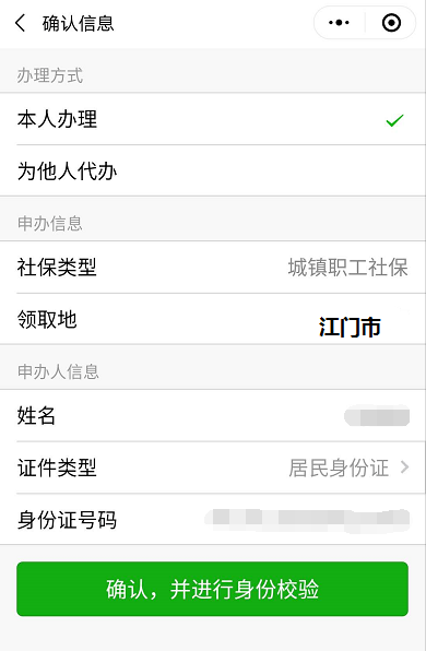 选择“本人办理”→核对界面显示的社保类型、领取地、姓名、身份证等信息是否正确→