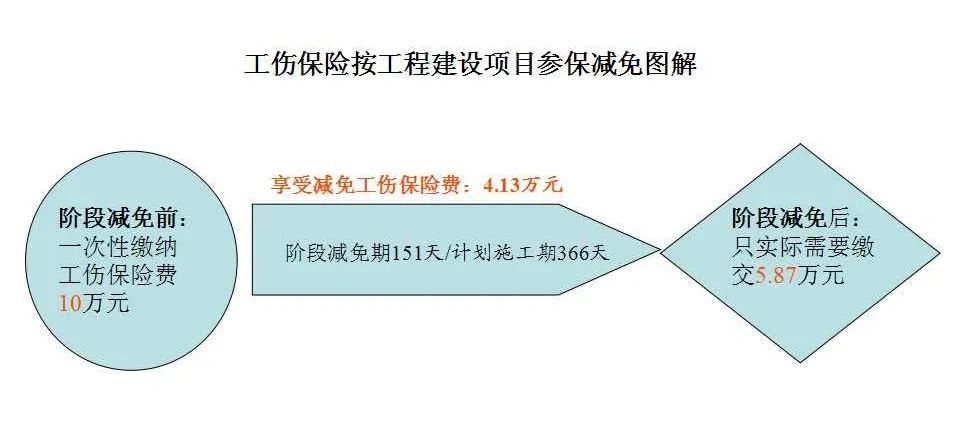 五、减免政策执行期为费款所属期 即在此期间补缴2月份之前的社保费或趸缴减免政策期之后的社保费,均不属减免政策范围。 六、新开工工程建设项目 2020年2月至6月新开工的工程建设项目按国家规定进行划型并享受相应的减免政策。 具体计算办法:按照工程建设项目计划施工所覆盖的减免期占其计划施工期的比例,折算减免工伤保险费。计划施工期及起止日期依据备案的工程施工合同核定。由社保费征收机构在核定缴费时直接予以减免,不需申请。 举个例子:某建筑项目的施工总承包单位属于中型企业,该建筑工程项目从2020年2月1日计划施工至2021年1月31日,按政策计算应一次性缴纳工伤保险费10万元。由于其属于减免期内新开工建设项目,且施工总承包单位为中型企业,可享受阶段性免征工伤保险费政策,覆盖的减免期为5个月共151天,则该项目可享受减免工伤保险费:4.13万元=10万元×(阶段减免期151天/计划施工期366天)×100%,即只实际需缴5.87万元。