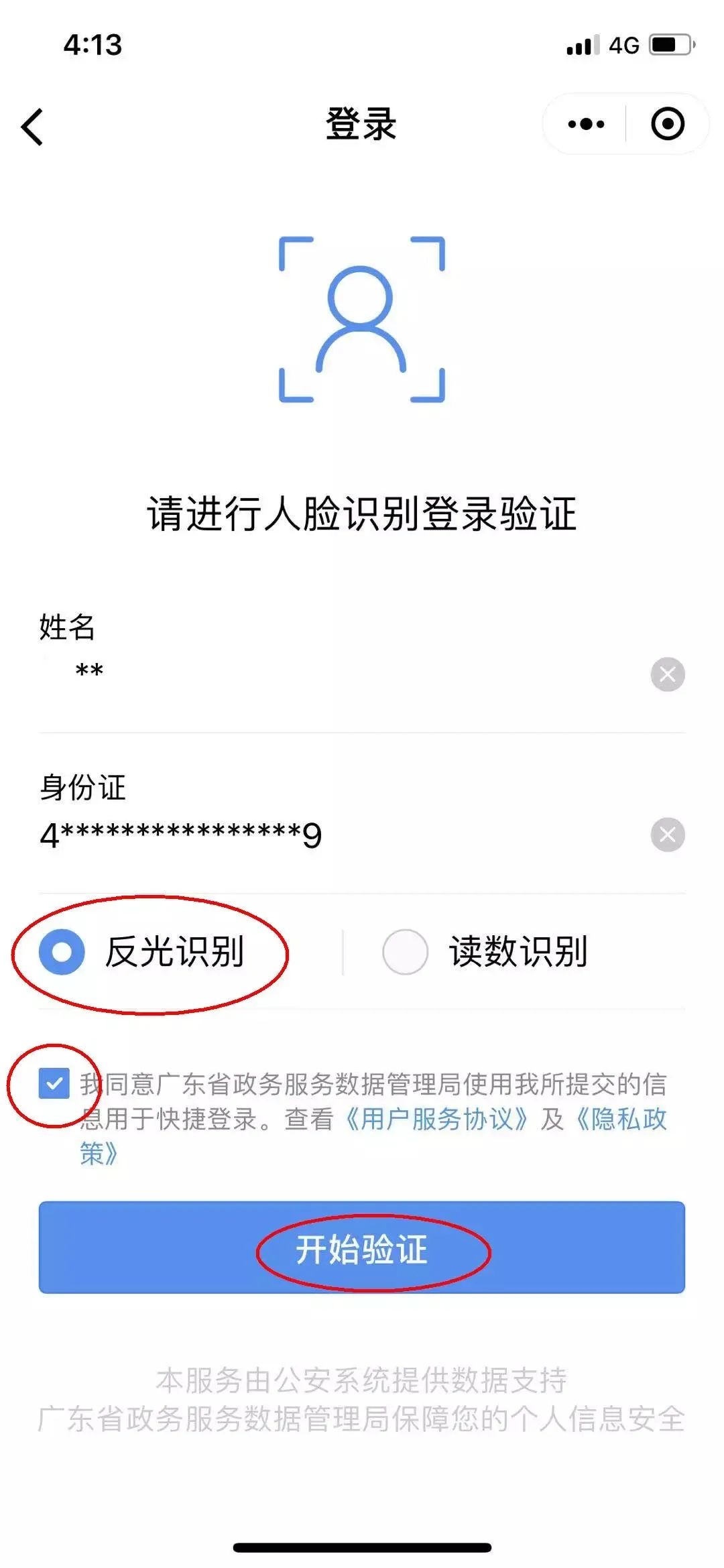 (2)人脸识别登录登录步骤:在登录方式选择界面钩选“人脸识别登录”→点击下一步→钩选反光识别(默认项)→钩选已阅读条例→点击开始验证→钩选已阅读条例→点击下一步→点击继续→按提示正对屏幕→识别成功→进入页面。