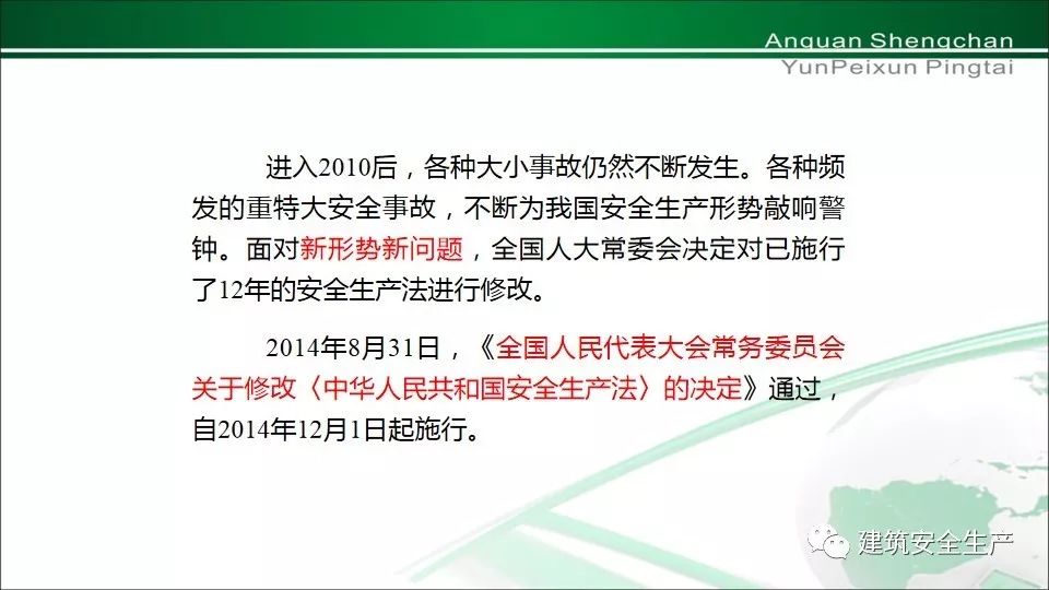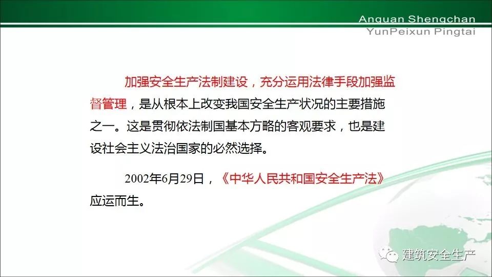 ︾ 12月的第一周(12月1日~7日)为《安全生产法》的宣传周,下面跟随小编一起来进一步熟悉它吧! PART 1 - 《安全生产法》的出台修订历程 PART 2 -为什么要颁布《安全生产法》? 它出生于2002年6月29日。它的诞生是为了加强安全生产监督管理,防止和减少安全事故,保障人民群众生命和财产安全,促进经济社会持续健康发展。 PART 3 -《安全生产法》的主要内容