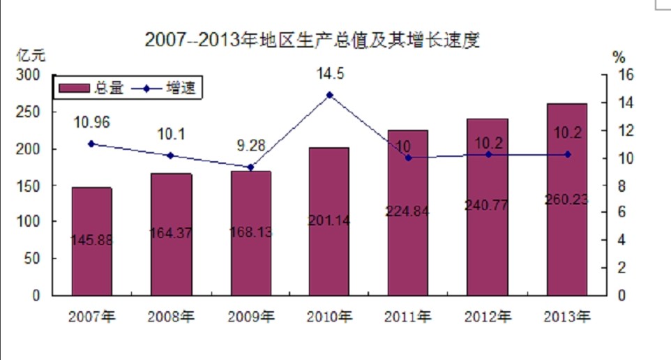 初步核算,2013年全市实现地区生产总值260.23亿元(当年价),比上年增长10.2%。其中:第一产业 增加值25.97亿元,增长1.9%;第二产业增加值131.33亿元,增长15.2%;第三产业增加值102.93亿元,增长5.2%。第一、二、三产业增加值的比重为9.98 :50.47 : 39.55。人均生产总值37039元。