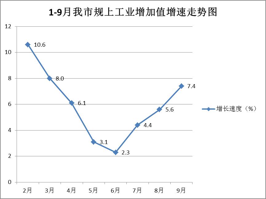 今年9月份,我市规模以上工业企业经济平稳运行,1至9月全市累计完成规模以上工业企业增加值87.8亿元,比去年同期增长7.4%,环比提升1.8个百分点,在江门四市三区中排名第五位。累计完成全年目标73.69%,比去年同期提高了0.1个百分点。在所有行业中,金属制品、装备制造行业保持高增长,9月金属制品业累计产值增长47.97%,装备制造业累计产值增长18.1%,两大行业带动我市规上工业经济增长。同时我市三大支柱产业规上工业增加值同比增长21.65%,其中食品制造业增加值比上年增长8.90%,化纤纺织服装制造业增长8.44%,水暖卫浴制造业增长46.30%,这三大支柱产业规上工业增加值占全部规上工业增加值的比重为52.35%,拉动我市规上工业增加值增长9.32个百分点。