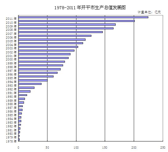 经济以跨越式发展的态势,经济总量不断壮大。2011年我市生产总值是224.84亿元,其总量是1978年的119倍。从1978年改革开放到2011年的34年间地区生产总值的年均增长速度是15.61%。其发展经历了以下三个阶段的跨越增长(见图1)。第一次跨越:于1989年,创造出经济总量超10亿元,总量达到11.21亿元,比1978年翻了5倍,1978年至1989年的年均增长率是17.67%;第二次跨越:于2003年,创造出经济总量超100亿,总量达到103.05亿元,比1989年翻了8倍,1990年至2003年的年均增长率是18.60%;第三次跨越:于2010年,创造出经济总量超200亿,总量达到201.14亿元,比2003年翻了1倍,2004年至2010年的年均增长率是10.03%。