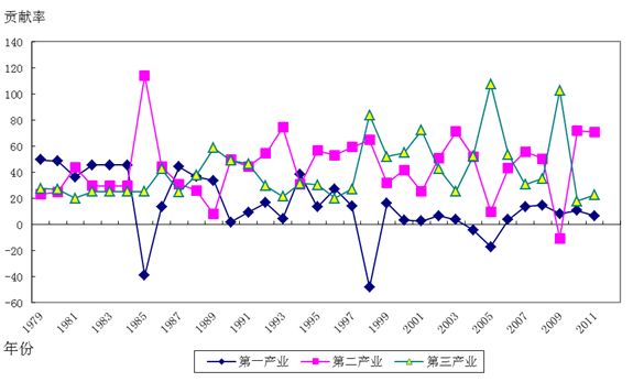 三次产业对生产总值的贡献率均值分别是:第一产业15.22%、第二产业43.95%、第三产业40.83%,具体表现如下:第一产业对经济的贡献由高到低发展。在改革开放初期对经济的贡献达40%以上,由1985年开始呈波动向下发展至2011年其贡献率只有6.5%;第二产业对经济的贡献由小到大。其在改革开放初期的贡献率只有20%左右,但随着改革开放的深入推进,尤其在工业经济的快速发展推动下逐渐成为主导产业,2011年对经济的贡献率达70.94%;第三产业对经济的贡献波动不稳。在改革开放三十多年中,第三产业呈与第二产业互补交替的合力之势对经济发展作出贡献。具体见图4: