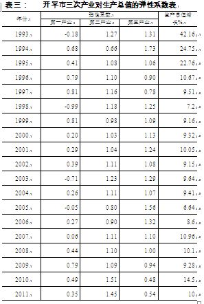 1993年—2011年的三次产业的增长速度,计算出其对生产总值增长的弹性系数,计算结果是:第一产业的弹性系数较小;第二产业的弹性系数高且较稳定;第三产业的弹性系数整体较高,但在2006年开始受金融风暴影响对经济的弹性系数逐步下降。具体见表三: