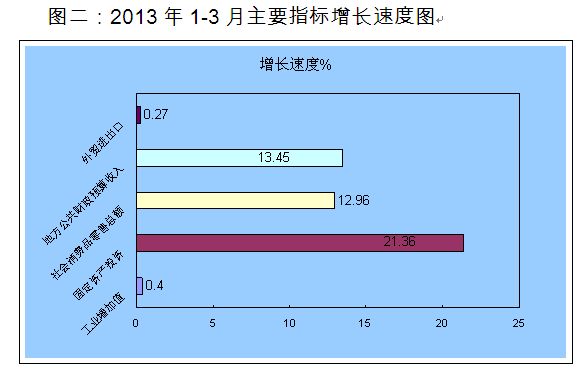 第一季度,工业增加值13.26亿元,比去年同期增长0.4%;固定资产完成投资额15.39亿元,比去年同期增长21.36 %;社会消费品零售总额达33.23亿元,比去年同期增长12.96%,;地方公共财政预算收入3.91亿元,比去年同期增长13.45%,增速比去年同期高出2.51个百分点;外贸进出口总额5.49亿美元,比去年同期增长0.27 %。