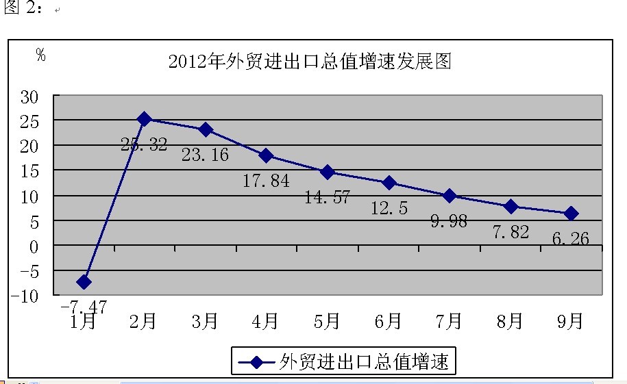进出口方面。从年初开始,我市的进出口总值增幅就一直走下坡路,至9月份止,我市实现进出口总值16.08亿美元,同比增长6.26%,比第二季度回落6.24个百分点、比第一季度回落16.9个百分点。见下图2: