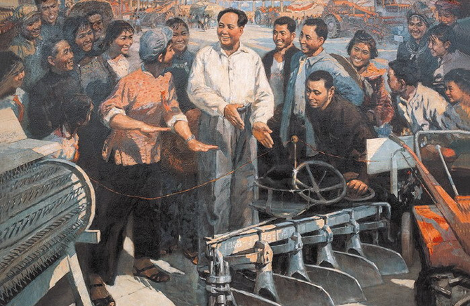 火伞高张,树荫合地,蝉声满耳。岭南盛暑,砾石流金。何须理会,闲来摇一艇小舟,泛粼粼清波,依水处,小桥旁,茅舍数间,修竹几丛。曲径蜿蜒去,一身醉入百果园,原来是这般嫣红姹紫开遍,浮翠流丹尽现。珠水之畔,二沙岛岸,李醒韬把梦香居遍栽之瓜果呈奉,以斑斓之色,着成无限潇洒无限凉的诗情。 石榴、荔枝、莲雾、红柿、杨桃……满眼琳琅,逞娇呈美。李醒韬笔下种出岭南佳果,皆娇妍欲滴,果香四溢,惹人伸手偷摘。试看垂垂石榴,若明珠串串,如火闪烁;再观荔枝,白玉薄笼妖色映,茜裙轻裼暗香飘;又有芭蕉,似是醉来将墨扫,伴以佳果旁,滴滴雨,叶叶风,好一片缤纷瓜果地,累累串串间,酝酿出如梦如幻的悠扬与清逸。 历代花鸟画作盈千累万,个中好手亦更仆难数,李醒韬何以独树一帜? 其言:一是世人画花,题材千篇一律,了无新趣,吾自画果兼画花,果为主,花为辅,另辟蹊径。二是主攻南方佳果,品类多、肉丰厚、色饱满。李醒韬曾为此赴科研所长期观察,家里亦种诸多石榴。“我的石榴画颇受欢迎。石榴又称吉祥果,民间寓意多子多福。”于此,李醒韬颇为自得。三者,将苍厚雄劲之风格注入南方的灵动清润中,构图大开大合,色泽更如彩练漫天舞,练过留痕,便是瓜果簇簇。李醒韬有最大花鸟画10米长,2米高,超越自然,气势自见。 李醒韬色彩修炼数十载,油画、宣传画、水彩、水粉乃至国画,纵横驰骋,均无俗气。李醒韬时刻自我警惕,国画之道,需牢牢把握传统笔墨,西画色彩只是借鉴配合。他的花鸟,色彩集中在果,无论赤橙黄绿青蓝紫,有冷暖、有明暗;浓淡相生,色墨交融,难调之极。造假之人,易露马脚,一眼洞穿。难怪乎当年王肇民戏称李醒韬为“色郎”,既是肯定,更是勉励。 李醒韬画路广,名作多,早载丹青史册。而近年主攻之国画,除却南粤佳果,还有岭南水乡。李醒韬出身侨乡开平,河涌绕稻田,渔舟唱晚霞,是毕生抹之不去的乡土情愫。虽曾有多次机缘移居国外,李醒韬最终留下,以清新俊逸之笔触,为故土水乡立传——“北方开门见山,大山大水常可目见;我生活在珠三角,定位水乡,最为熟悉最具感情。有评论称我的山水画‘有水无山’,此非但定位准确,且国内鲜见。”一段时期后,为寻更雄气派,李醒韬始落墨花鸟。 《毛主席视察农机馆》