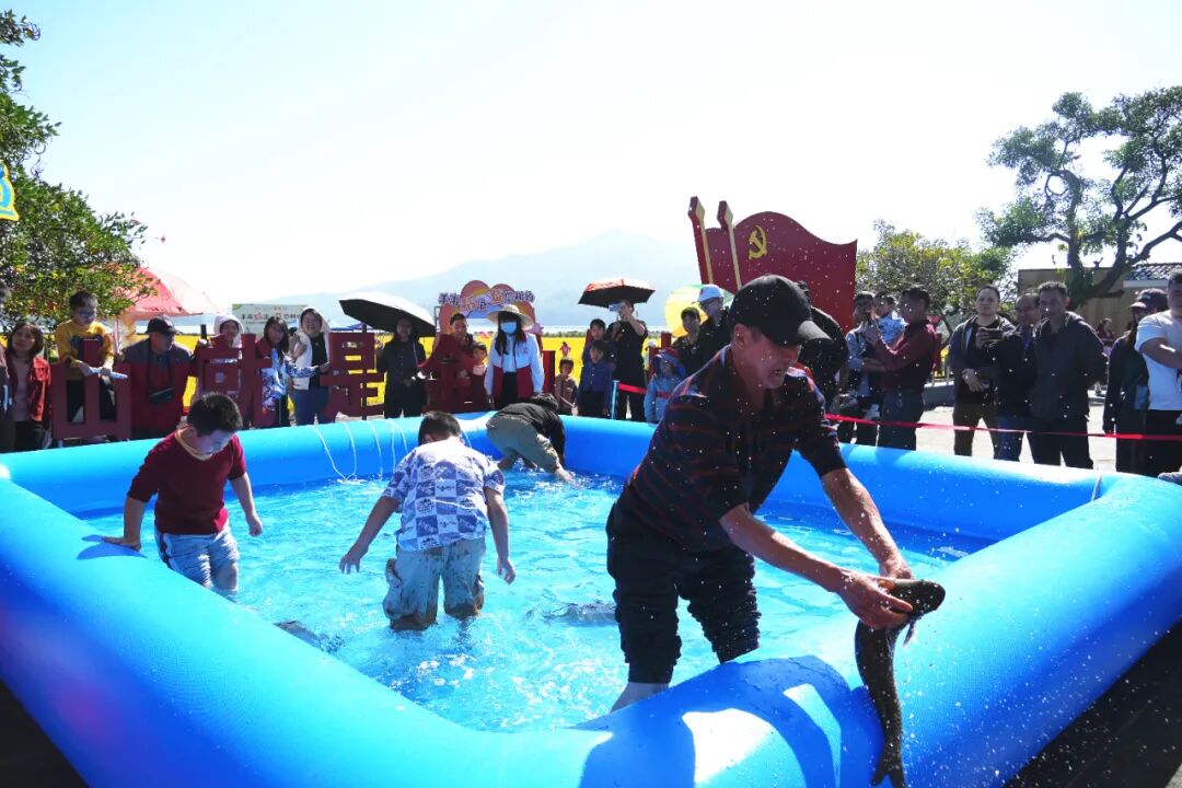本次活动现场设置了鱼王竞猜、开平优品市集展销和趣味捉鱼体验等多个项目,吸引了众多市民游客参与。作为亮点环节,“鱼王竞猜”依托线上公众号提前发起竞猜,现场公布了今年的“冠军鱼王”重达33.1斤。与此同时,开平优品摊位前,马冈鹅、丝苗米、水果等各类产品整齐陈列,不时有市民游客认真挑选心仪的商品;旁边的趣味捉鱼区,大人和小孩挽起衣袖和裤子踏入水池,专注地寻找目标,亲手体验捕鱼的乐趣,热烈的气氛吸引了游客驻足围观。南海游客梁先生表示:“听说大沙镇有捕鱼周活动,我们专程开车来玩。沿着绿道散步,在水库边喝杯奶茶、咖啡,消费达标后体验了捉鱼。今天很幸运,捉到两条鱼!这里山清水秀,环境很舒服。”
