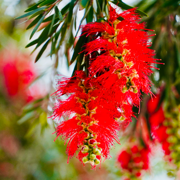 其实此“柳”非彼“柳”,这种开满鲜红花朵的植物名为“垂枝红千层”,又名“串钱柳”,原产自澳大利亚,引入我国不过百来年,是一种常绿灌木或小乔木,花叶都极具观赏性。幼枝和幼叶上都有一层薄薄的白色绒毛,远远望去就像笼罩着一层雾气,颇有一种特殊的神秘气息。垂枝红千层是城市中常见的行道树、风景树,多用于沿路、沿江河生态景观建设,且垂枝红千层在满足园林审美的同时,还能起到净化空气、减少尘埃、吸收噪音的效果,堪称“花界劳模”。 垂枝红千层花期长 较集中于春末夏初 性喜温暖湿润气候 在开平近日连绵阴雨天气的滋润下 垂枝红千层开得 比往年更为艳丽 在朦朦雾气中 与街景、车流一同营造出了 一片影影绰绰、流光幻影般的 “王家卫”式电影效果 为“绿美开平”增添了一笔 浓墨重彩的春日“繁花”景象