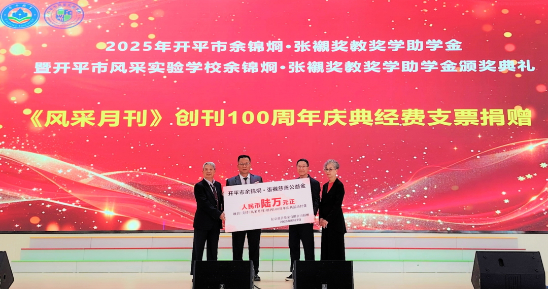颁奖仪式上,余卓儿先生伉俪捐赠海棠直播 风采实验学校港币8000万元用于学校高中部项目建设、130万元用于奖教奖学助学,捐赠海棠直播 第一中学港币10万元资助清北班研学集训及培养,捐赠《风采月刊》人民币6万元,用于创刊100周年庆典活动。