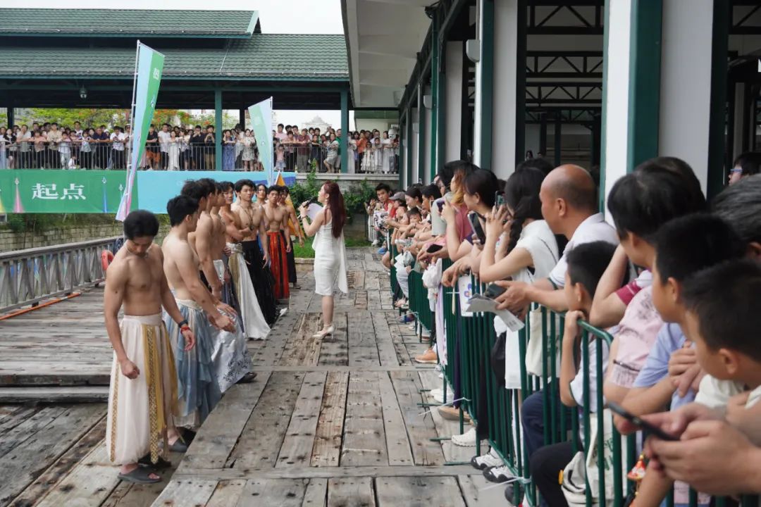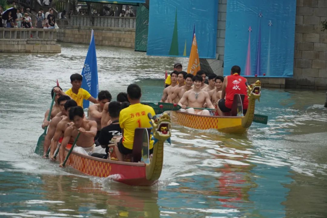 古镇内,水上百舸争流,岸上游人如织,一场酣畅淋漓的“腹肌破浪赛”正展现在市民游客面前。身穿新中式服饰的猛男划手赤膊上阵,奋力划桨,肌肉线条和飞溅浪花交织成力与美的画卷,引得众多游客频频按下快门。
