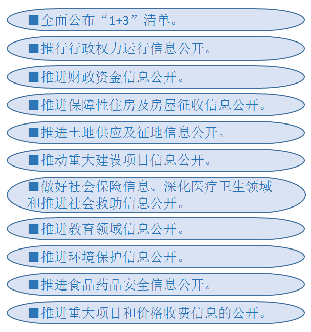 1、完善政府信息公开工作考核、社会评议、责任追究等配套制度,明确政府信息公开的范围、方式和程序。