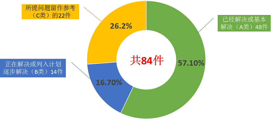 2015年,海棠直播 十五届人大五次会议及闭会期间,政府系统共收到人大代表提出的建议84件,截至2015年9月底,本次建议已全部办理完毕,办复率100%。其中,已经解决或基本解决(A类)的有48件,占总数的57.1%;正在解决或列入计划逐步解决(B类)的14件,占16.7%;所提问题留作参考(C类)的22件,占26.2%。代表对建议办复的满意或基本满意率达到100%。
