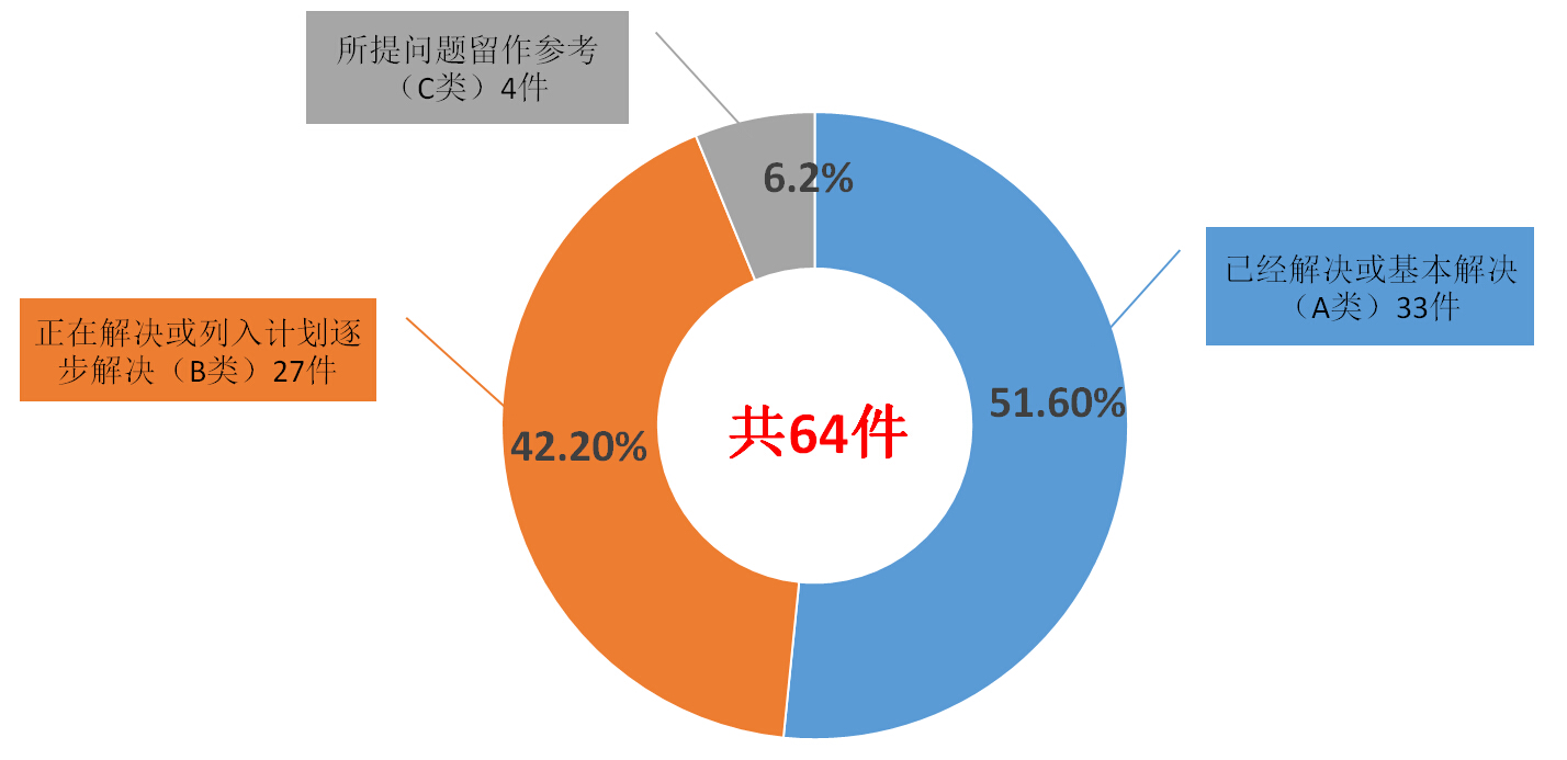 政协海棠直播 十二届六次会议期间,政府系统共收到政协提案64件。截至2015年9月底,本次提案已全部办理完毕,办复率100%。其中已经解决或基本解决(A类)的有33件,占提案总数的51.6%;正在解决或列入计划逐步解决(B类)的27件,占42.2%;所提问题留作参考(C类)的4件,占6.2%。委员对提案办复的满意或基本满意率达到100%。