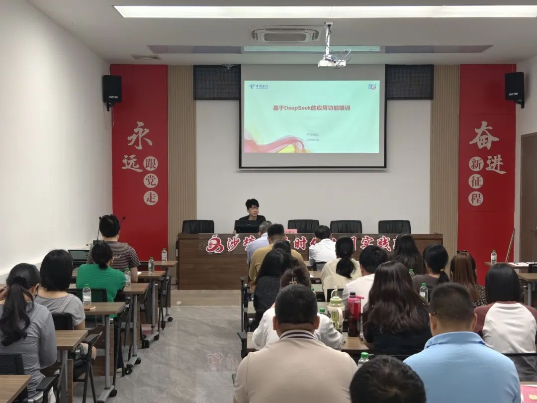 此次培训特邀中国电信开平分公司解决方案经理谭俊涛授课,围绕DeepSeek的使用方式、DeepSeek+场景应用、DeepSeek的应用安全等方面进行详细讲解,并结合实际案例演示了DeepSeek优化公文处理、进行数据分析、精准解读政策等功能,直观地展示了DeepSeek对于提高日常工作效率的重要作用。