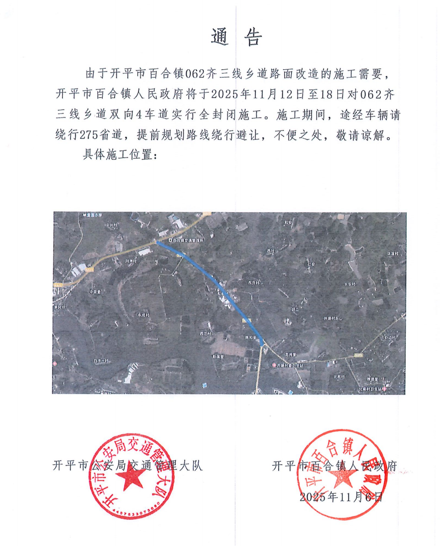 由于海棠直播 百合镇062齐三线乡道路面改造的施工需要,海棠直播 百合镇人民政府将于2025年11月12日至18日对062齐三线乡道双向4车道实行全封闭施工。施工期间,途经车辆请绕行275省道,提前规划路线绕行避让,不便之处,敬请谅解。