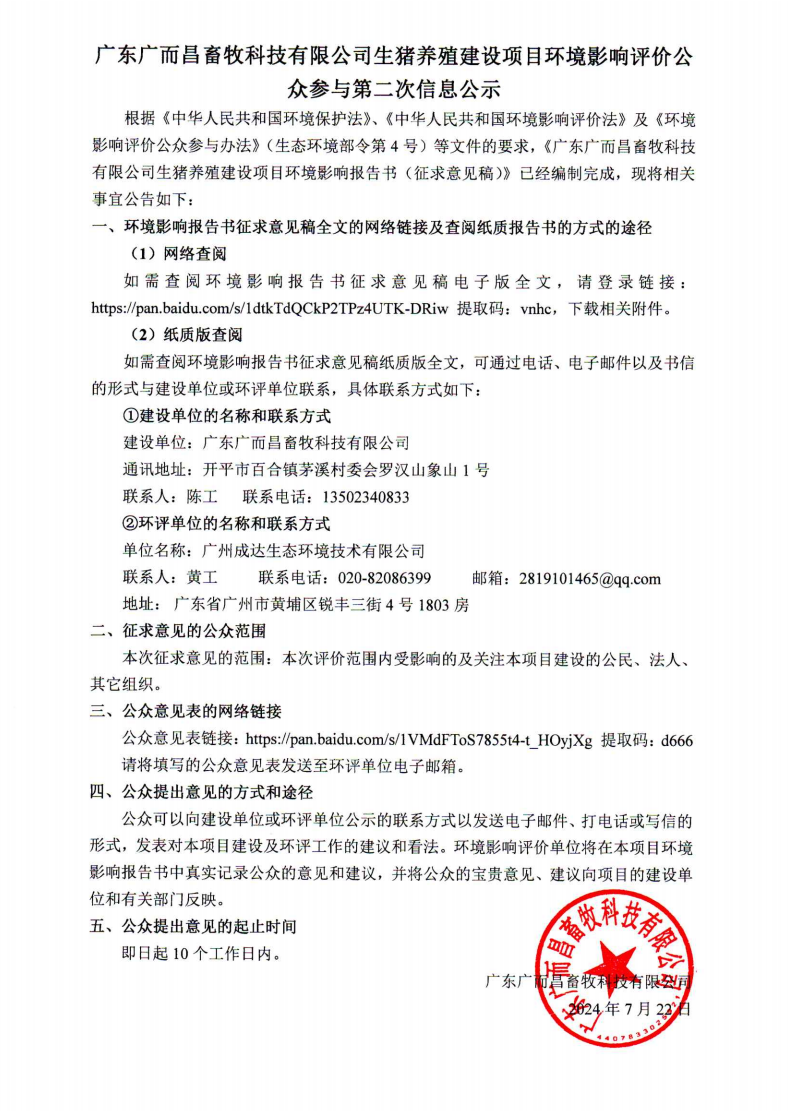 广东广而昌畜牧科技有限公司生猪养殖建设项目环境影响评价公众参与第二次信息公示
