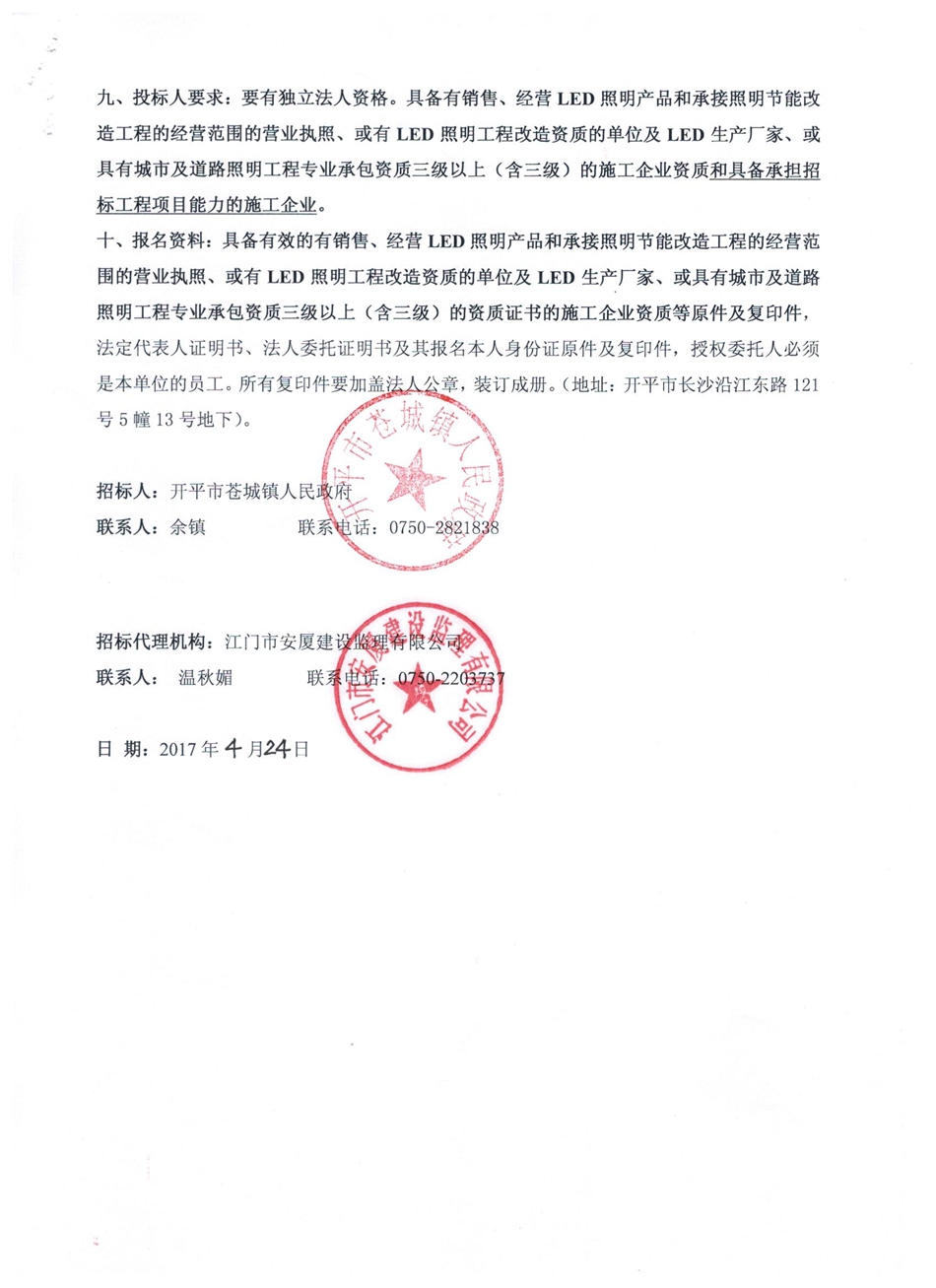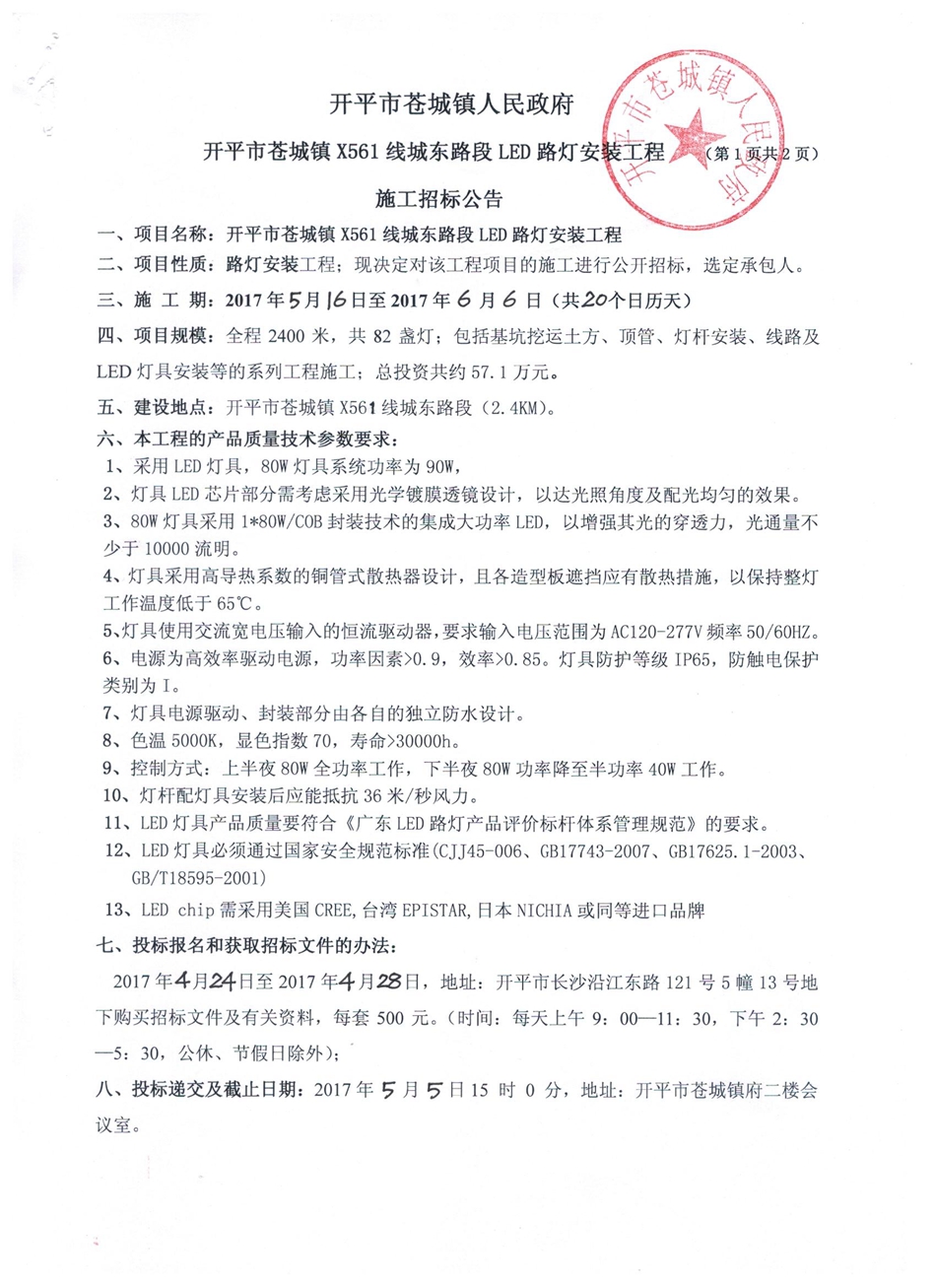 海棠直播 苍城镇X561线城东路段LED路灯安装工程施工招标公告
