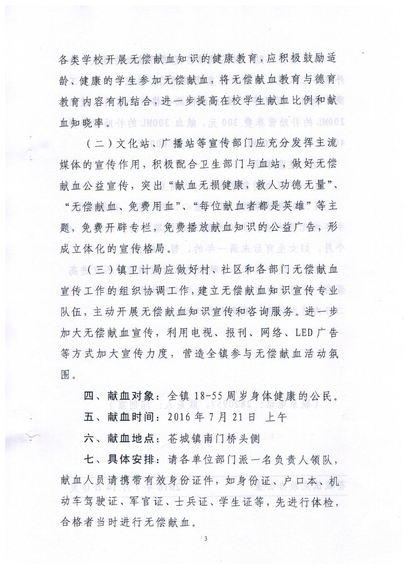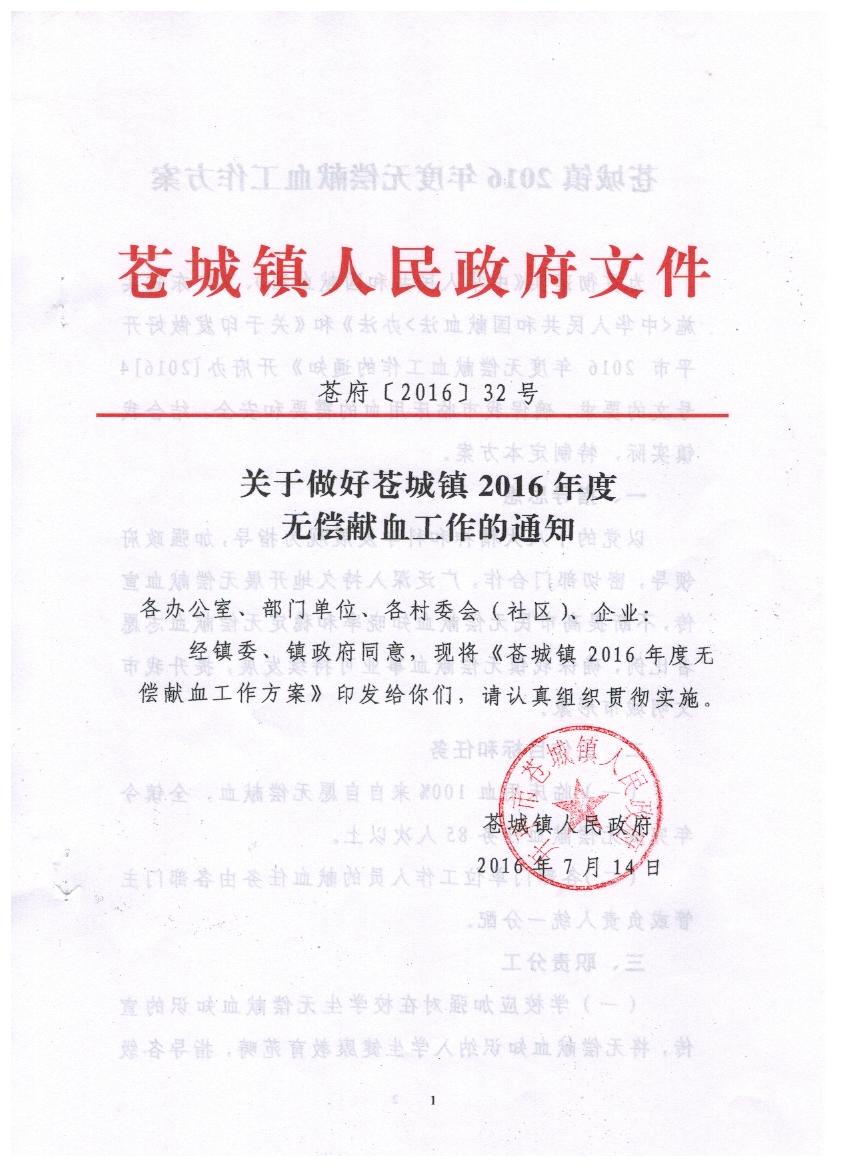 关于做好苍城镇2016年度无偿献血工作的通知