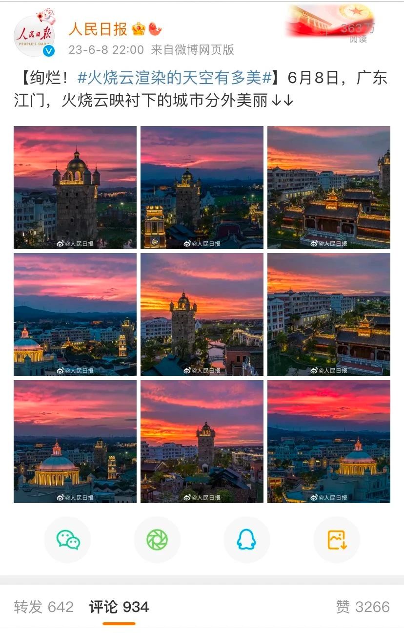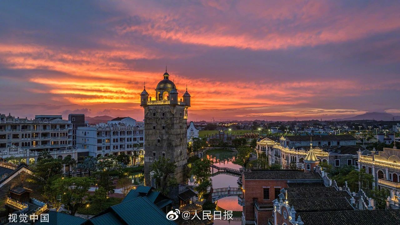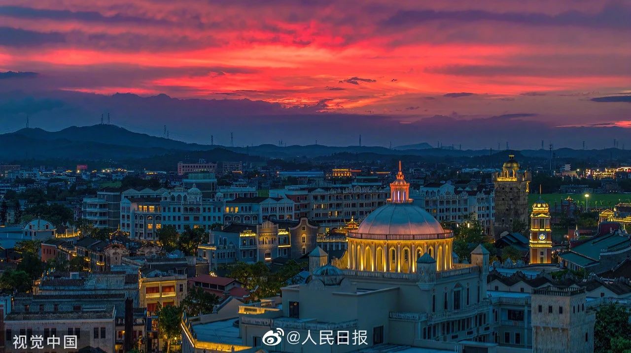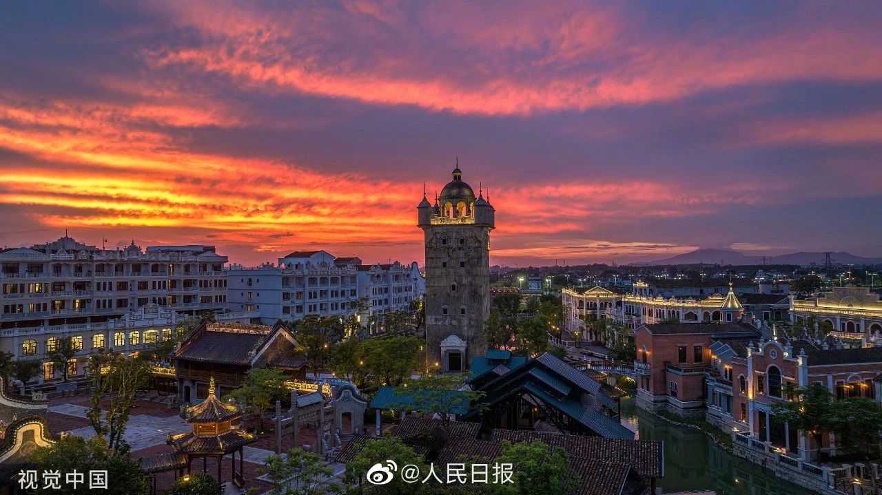 6月8日晚上,人民日报微博登出了开平赤坎华侨古镇上空的火烧云美景,在火烧云的映衬下,赤坎华侨古镇显得格外迷人。