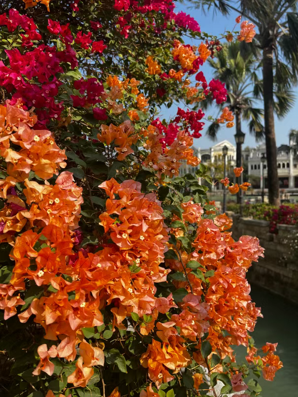 暖冬的阳光洒在花瓣上,折射出细碎的金光,漫步其中,花香萦绕鼻尖,偶尔有摇橹船从水面划过,船桨激起的涟漪倒映着花影与碉楼轮廓,宛如一幅流动的侨乡水墨画,每一处都是风景。游客们纷纷拍照感受这份独有的宁静与美好。