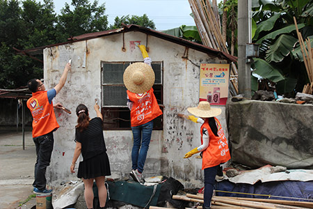 环保小队拿上刷子、小桶及铲子,分工合作,主要对社区街巷的站牌、路边灯柱上印制、粘贴的小广告等“牛皮癣”顽症进行集中清除。每刷一堵墙,义工们的手臂上、头上都沾上了刷掉下的纸屑。由于天气比较热,刚清理完一段告示牌和灯柱,大家已经满头大汗,但是挥动刷子的频率丝毫没有降低。刷子刷不掉的“牛皮廯”,义工们直接用手去撕下来。近一个小时的辛勤劳动后,梁金山社区市场两旁的牛皮廯被清理干净,墙壁和灯柱终于干净了。