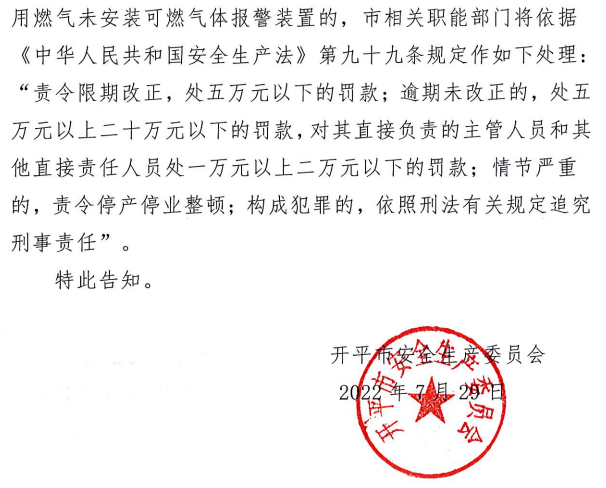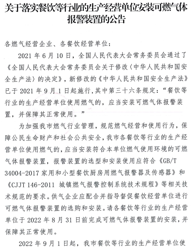 关于落实餐饮等行业的生产经营单位安装可燃气体报警装置的公告