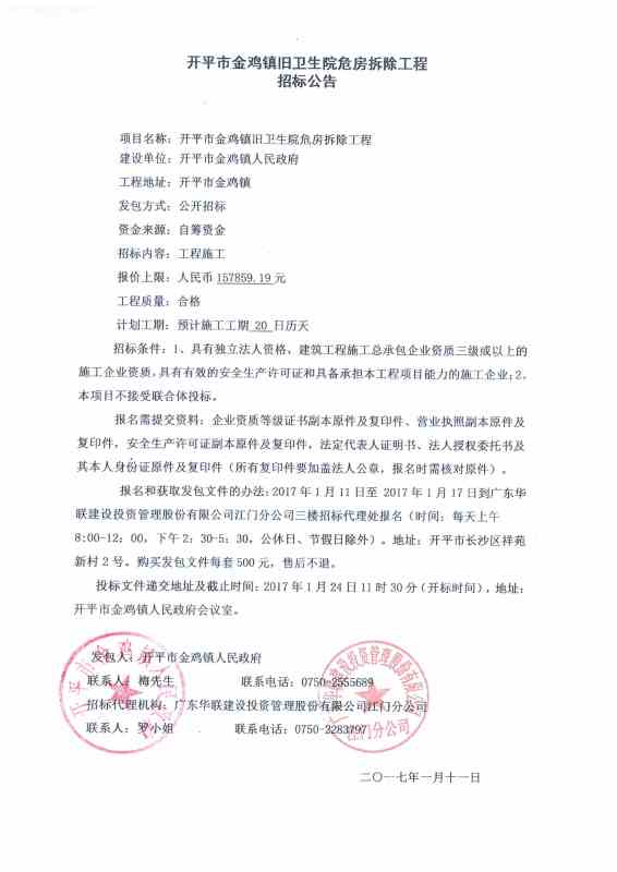 海棠直播 金鸡镇旧卫生院危房拆除工程招标公告