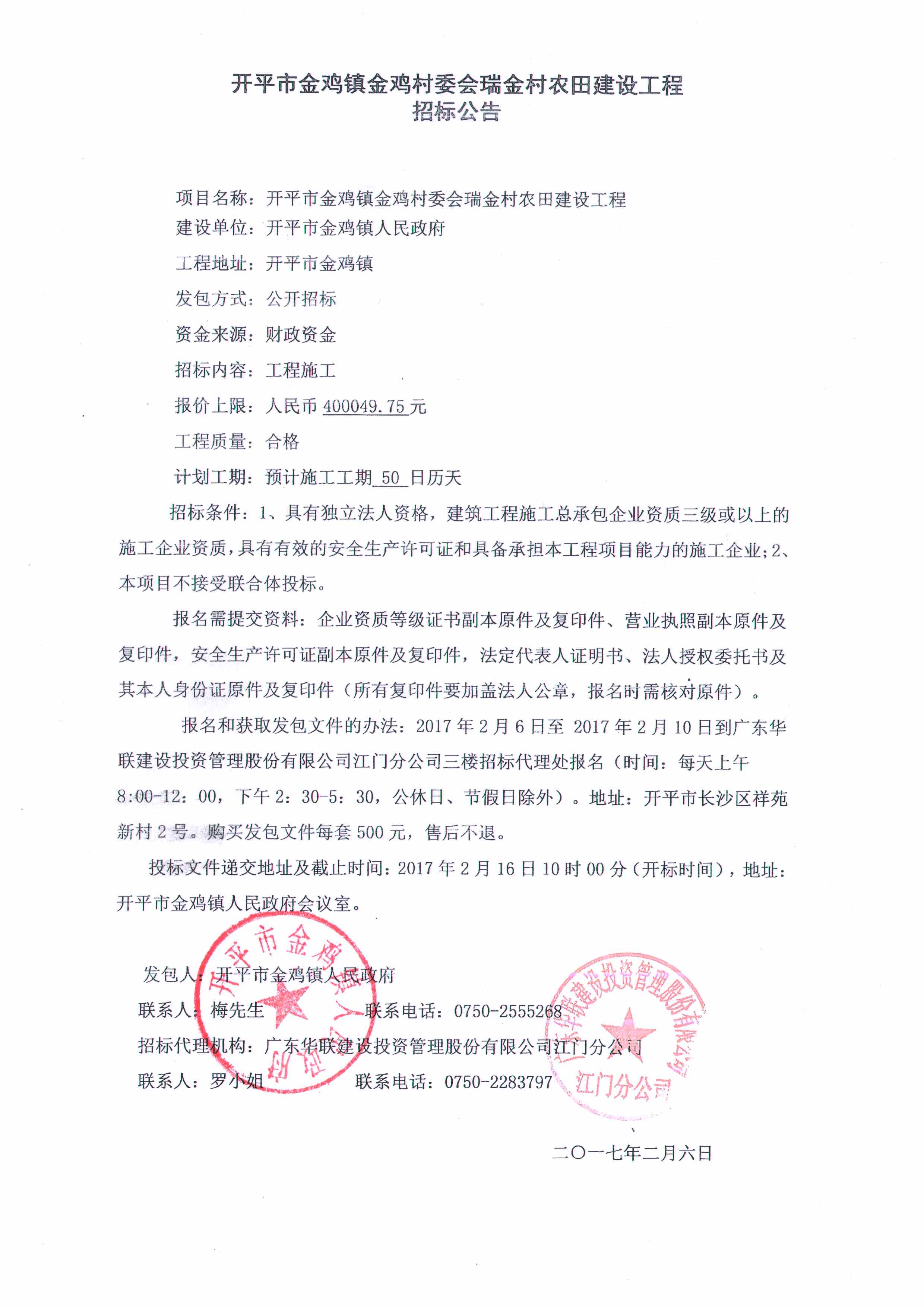 海棠直播 金鸡镇金鸡村委会瑞金村农田建设工程招标公告
