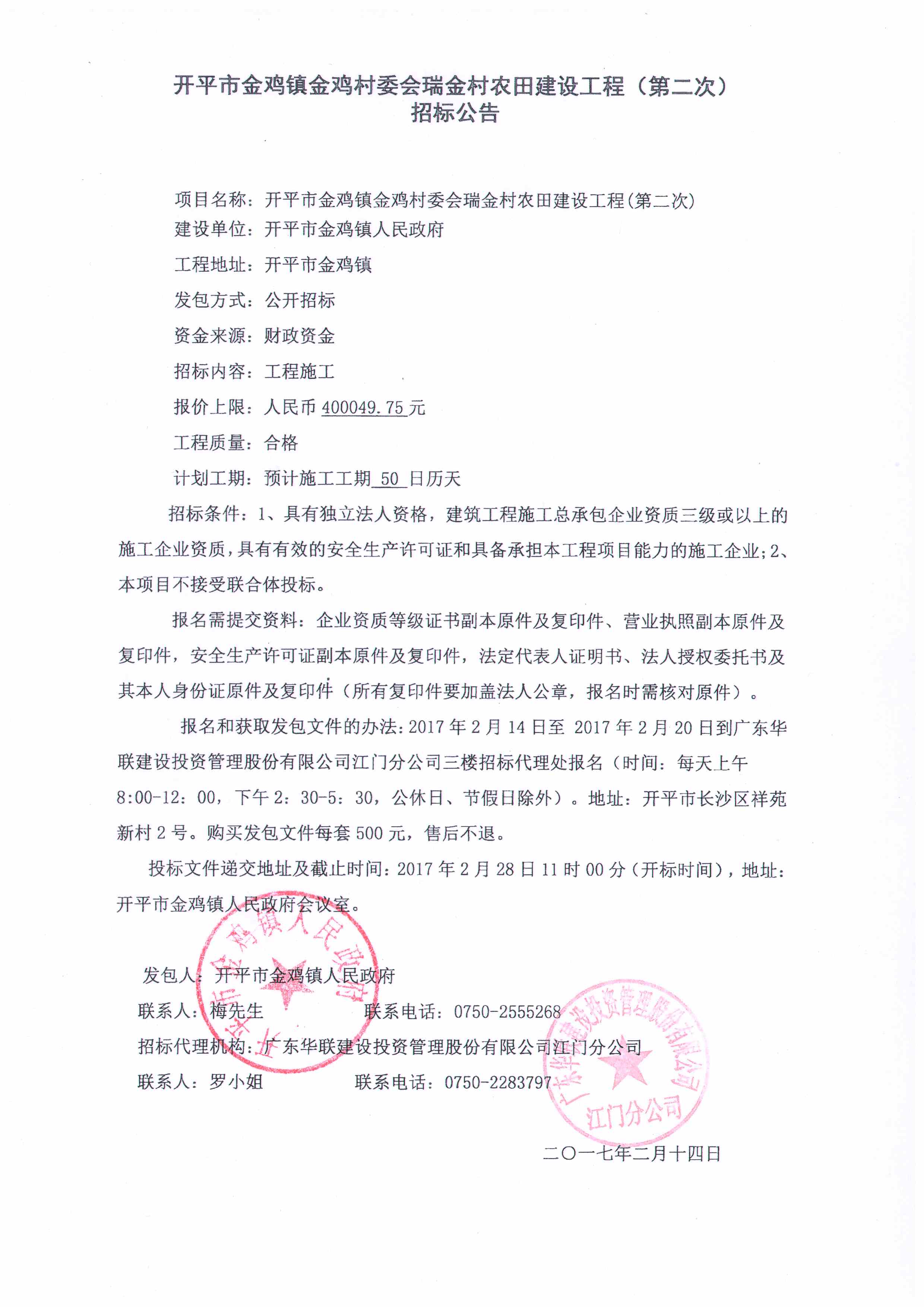 海棠直播 金鸡镇金鸡村委会瑞金村农田建设工程招标公告(第二次)