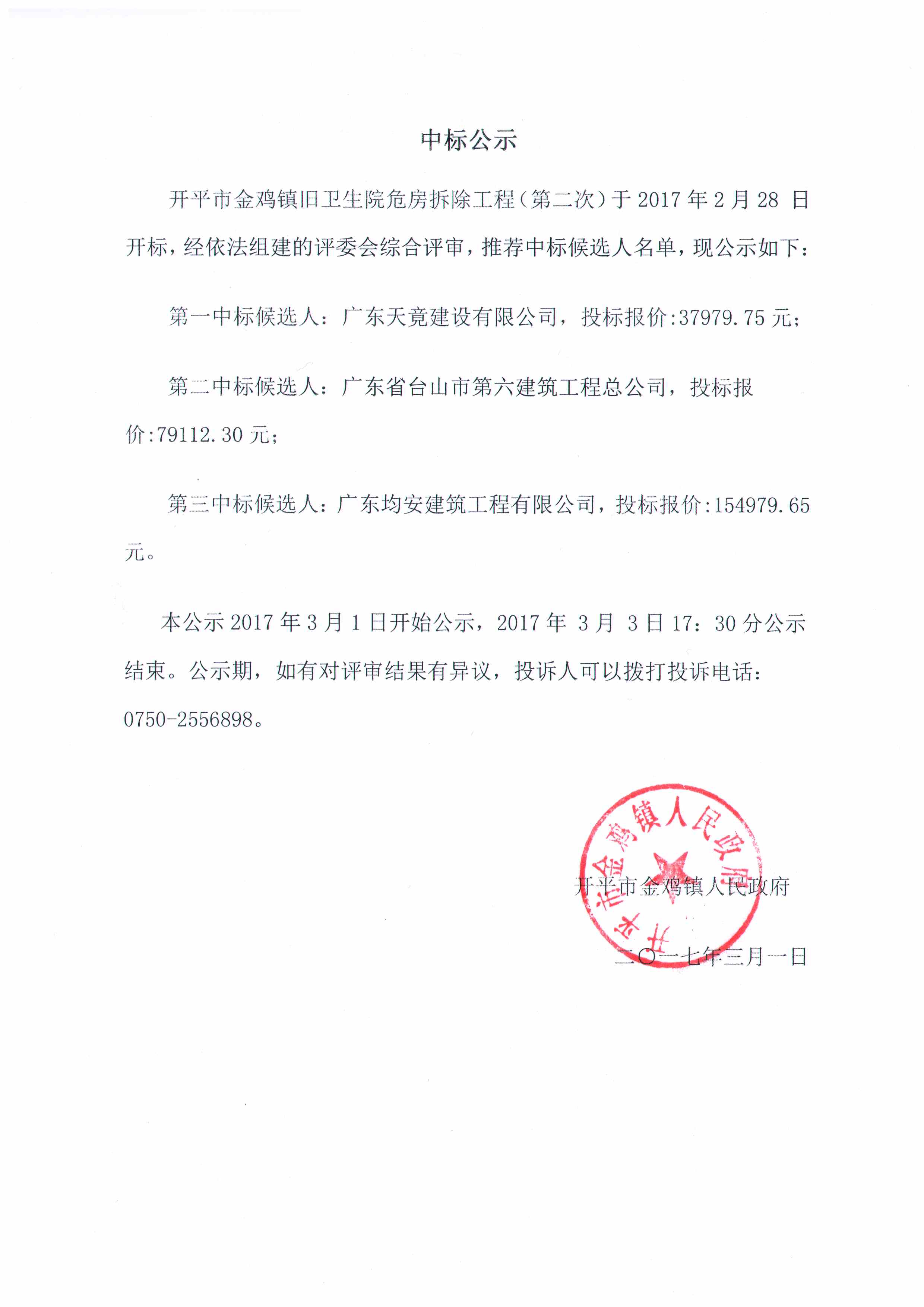海棠直播 金鸡镇旧卫生院危房拆除工程中标公示