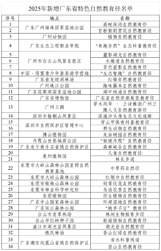 今年以来,全省新建成34条特色自然教育径,全省特色自然教育径总数达到175条,超额完成了广东省自然教育发展“十四五”规划任务!据悉,广东省特色自然教育径主题多样、覆盖广泛,总长度超过300公里,开发配套课程400余门,其中超过120条免费向公众开放,为公众提供丰富多样的自然教育室外空间。 打造“自然+人文”特色路径 “十四五”期间,广东持续推进自然教育场所体系建设,全面完成来自然教育基地和自然教育径建设目标任务,初步形成了覆盖全省的多类型自然教育场所体系。 广东省林业局相关负责人介绍:“新公布的广东省特色自然教育径在主题融合、课程体系与技术应用领域均实现了提质升级,全线配备自然教育标识系统和互动体验设施,平均每条自然教育径配套2门以上课程,较往年有明显提升。” 值得一提的是,新增的自然教育径更注重特色资源开发,通过融合生态环境、本土文化与艺术元素,持续深化“自然+人文”的融合发展格局,如广州兰圃人文自然教育游径,为14株特色花木赋予“花中君子,将岭南园林艺术与生态科普融合,打造了沉浸式人文自然体验场景。 推动自然教育体系化发展 广东特色自然教育径以“技术赋能生态叙事、文化活化资源价值、实践联通保护行动”为特色,构建了立体自然教育体系。这些自然教育径主题丰富,涵盖动植物保护、生态修复、森林文化、绿美实践等领域,为公众提供近距离接触华南虎、穿山甲、黑脸琵鹭、紫纹兜兰等珍稀动植物的机会,开辟了公众了解林业工作的重要窗口。 在实践创新方面,深圳市自然保护区管理中心穿山甲保育径通过仿生野外环境展现穿山甲自然行为,结合保育员对物种保护现状的深度解说,有效引导公众从自然观察向主动参与保护行动转化;丹霞山世界地质公园的“秘境丹霞”自然教育径通过动态展示丹霞地貌的亿年演化历程,结合丹霞兰等珍稀植物的保护实践,实现了自然探索与生态认知的有机融合。新一批自然教育径充分运用科技手段赋能生态教育,深度融合地方文化特色,创新实践参与模式,为公众提供了全方位、多层次的自然教育体验。 下一步,广东将持续推进自然教育建设,为自然教育发展赋能,强化自然教育径基础建设、课程体系、讲解服务等方面的能力,深挖地域生态人文资源,孵化精品课程,推动自然教育径与生态旅游、文化创意等产业的深度融合,为公众提供更高质量的自然教育服务,打造具有粤港澳特色的一流自然教育品牌,讲好绿美广东故事,赋能绿美广东生态建设。