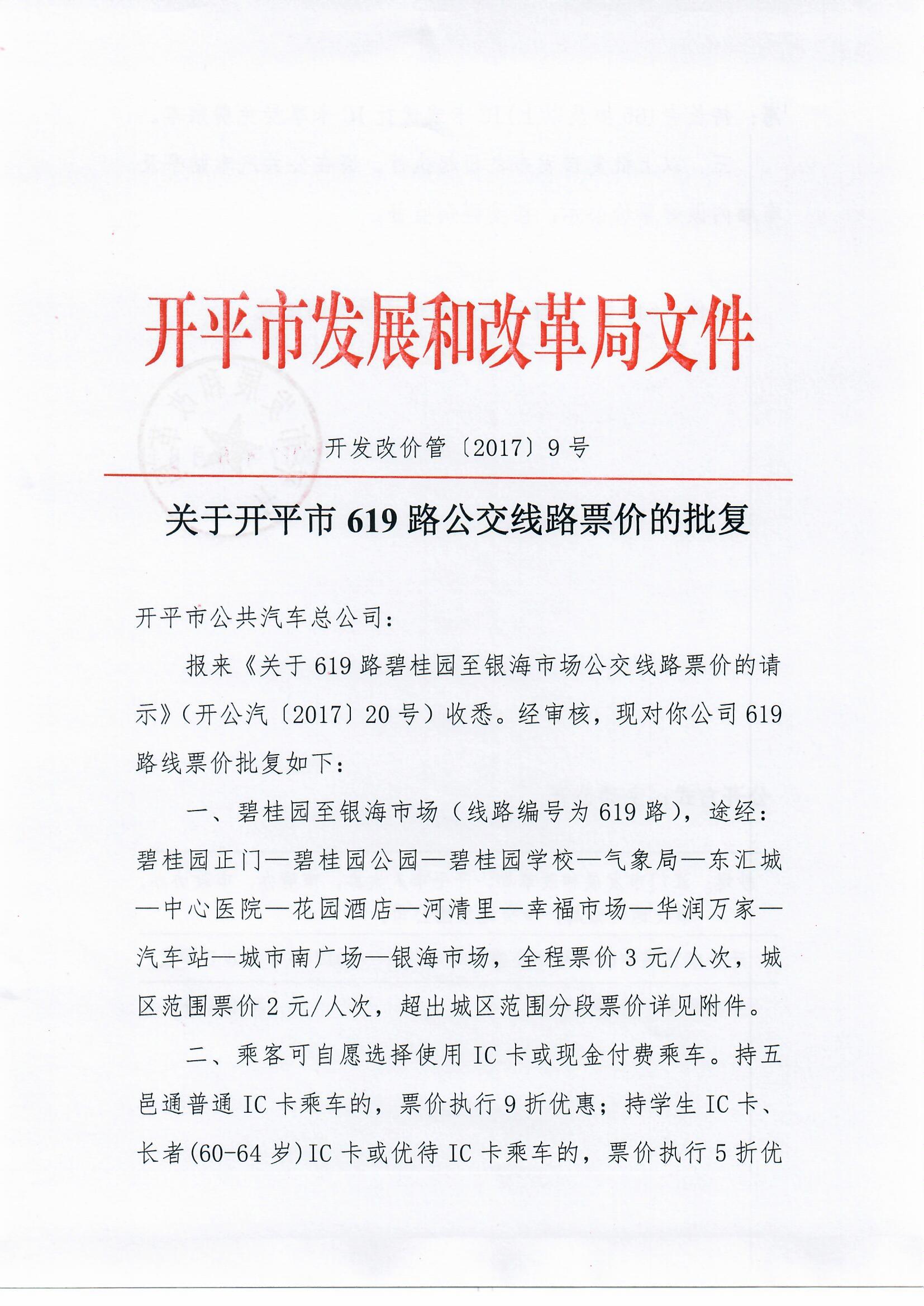 开发改价管〔2017〕9号 关于海棠直播 619路公交线路票价的批复