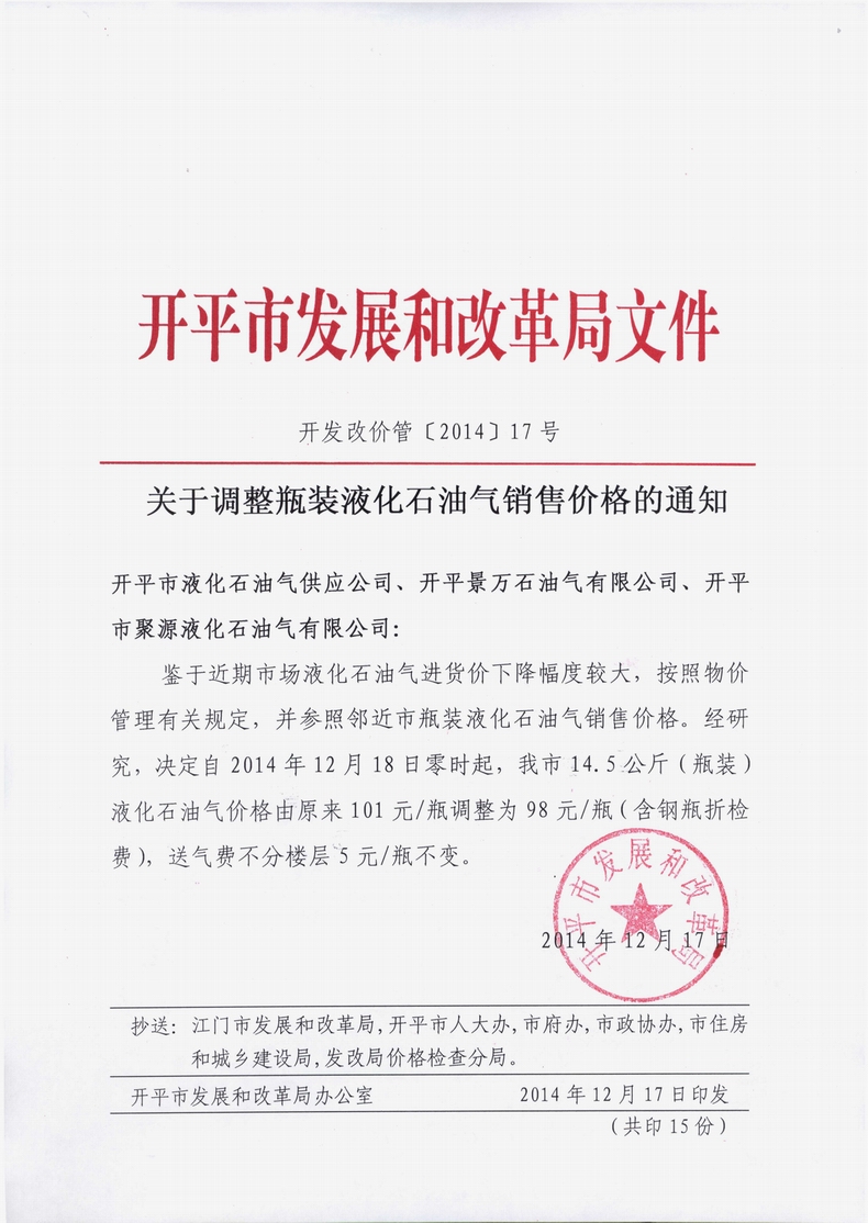 开发改价管[2014]17号 关于调整瓶装液化石油气销售价格的通知
