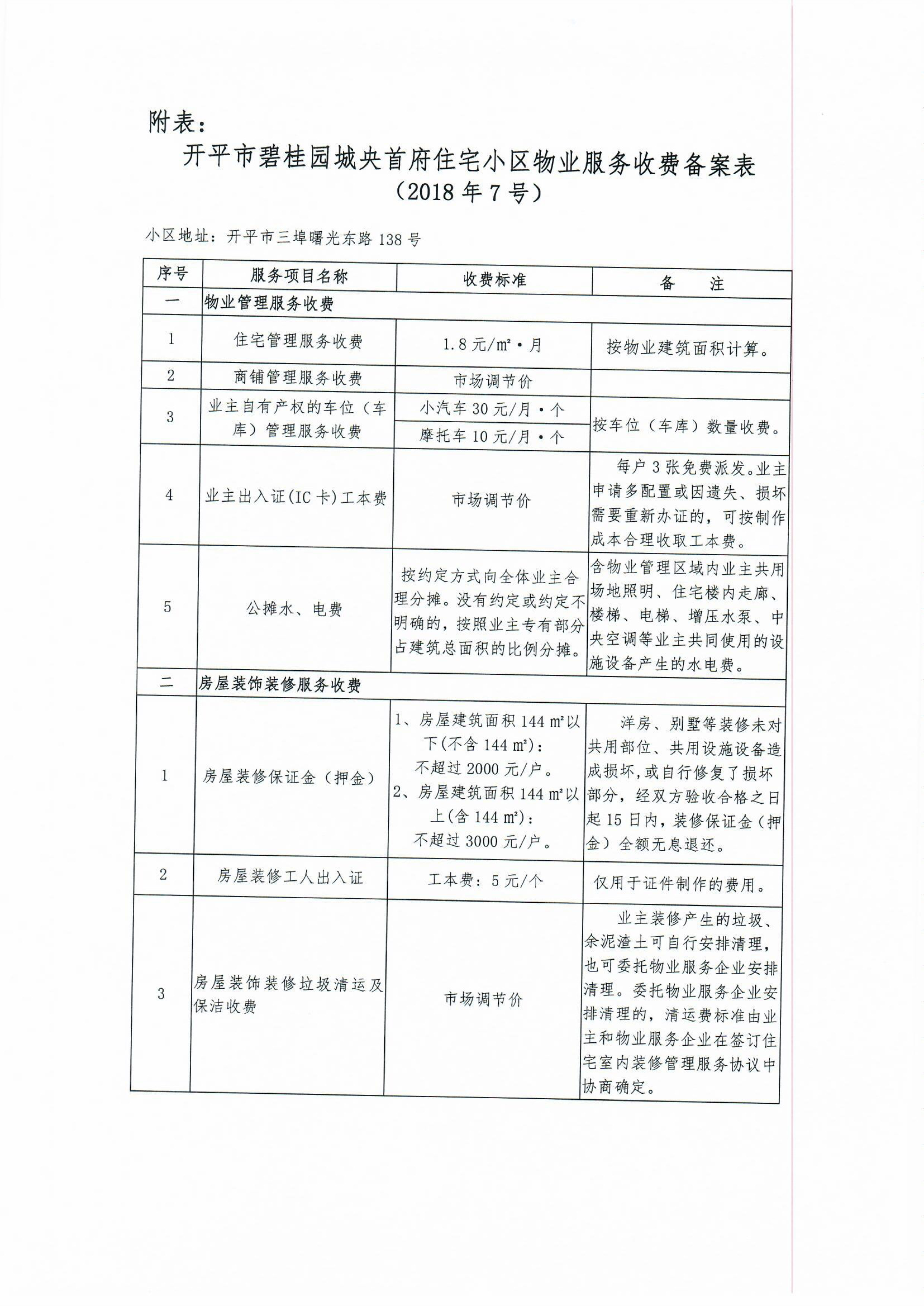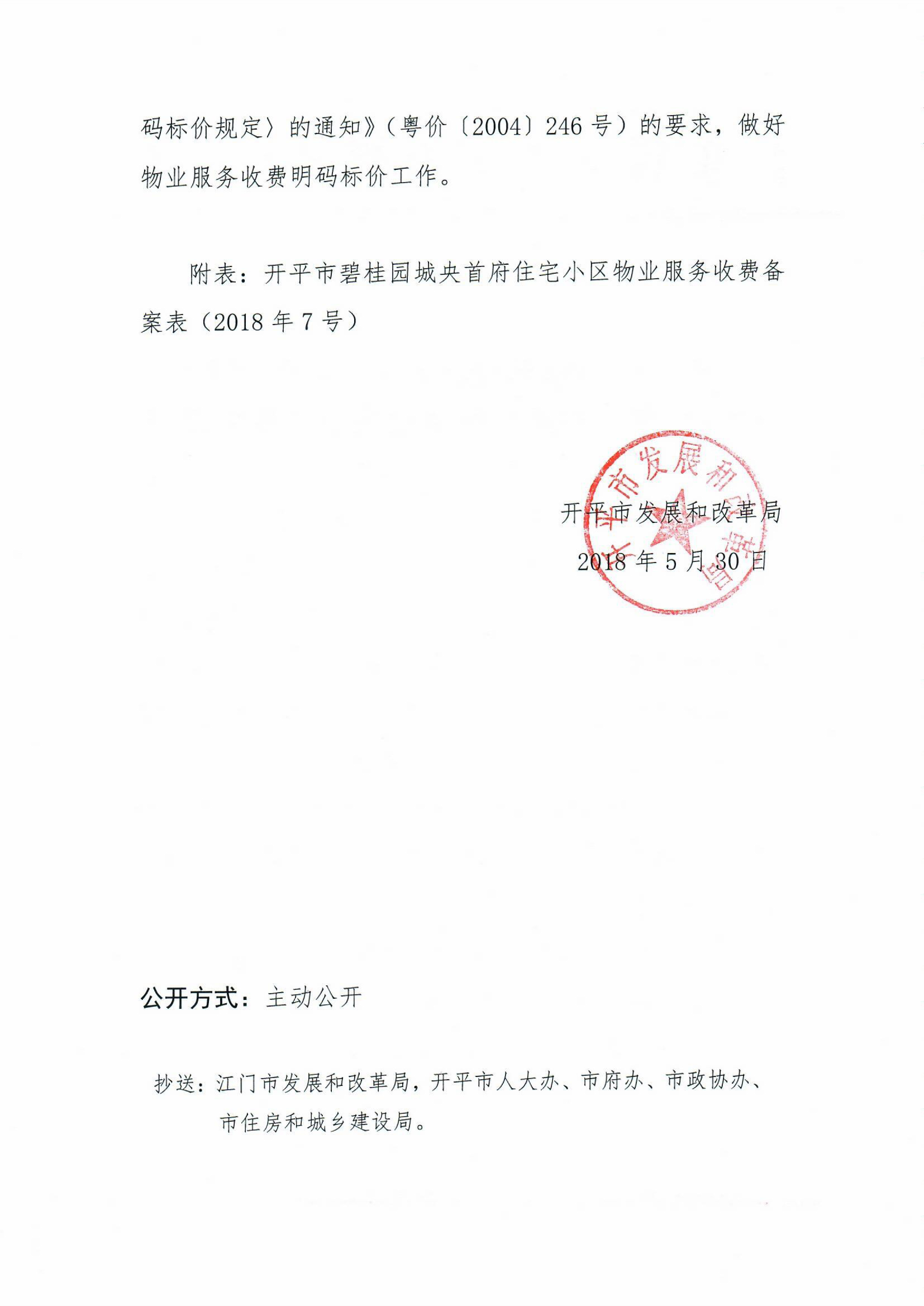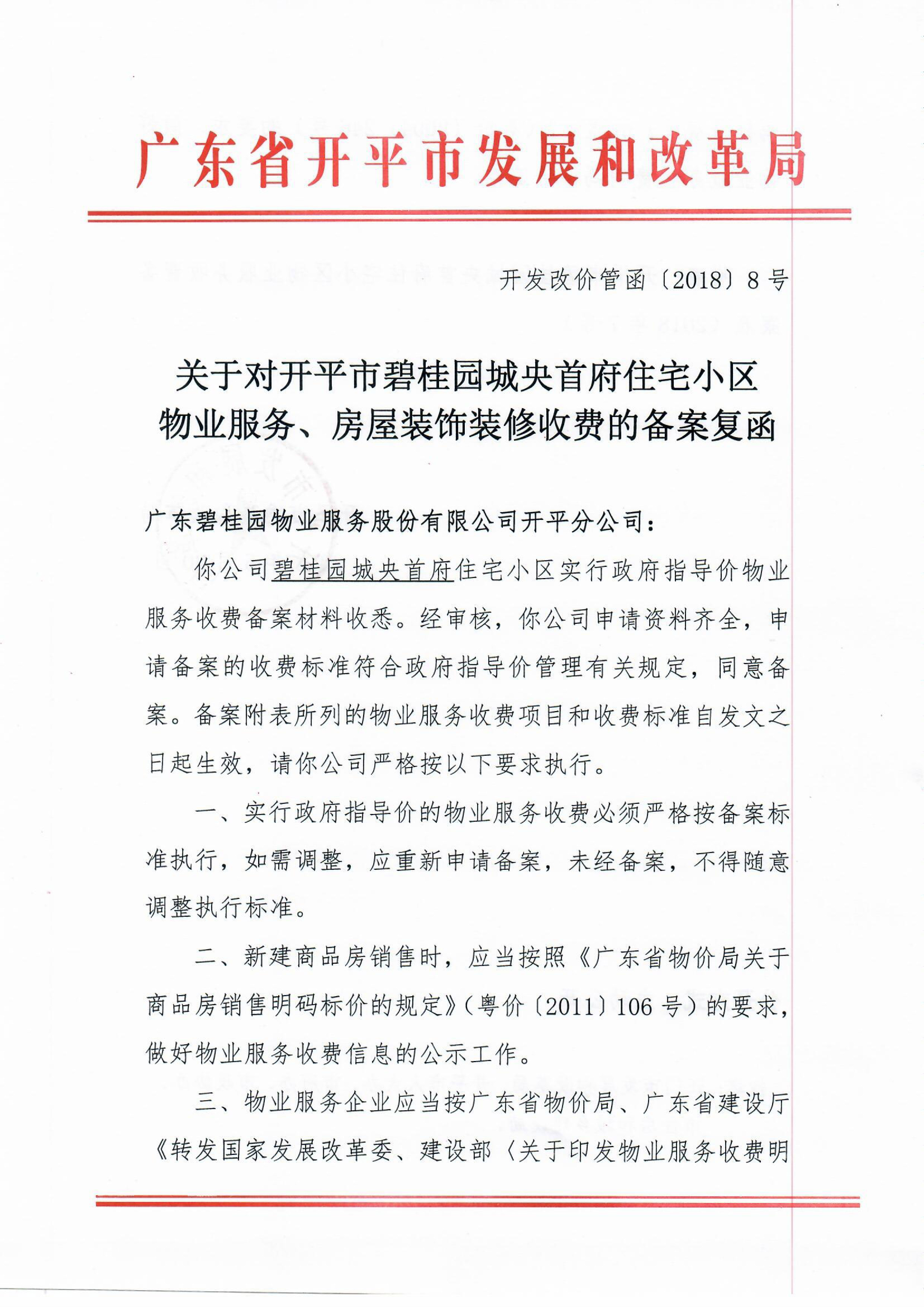开发改价管函〔2018〕8号 关于对海棠直播 碧桂园城央首府住宅小区物业服务、房屋装饰装修收费的备案复函