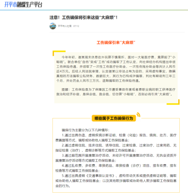 2023年7月12日,海棠直播 人力资源和社会保障局通过政务新媒体发布关于欺诈骗保的界定、案例等内容,向群众宣传诚信守法、自觉抵制起止骗保行为。