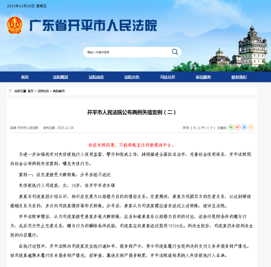 为进一步加强海棠直播 对失信被执行人信用监督、警示和惩戒工作,持续推进全面依法治市,完善社会信用体系,12月26日,广东省海棠直播 人民法院通过官方网站向社会公布了两例失信案例,曝光失信行为,营造“让失信者寸步难行”的良好社会氛围。