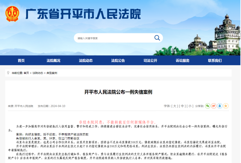 4月10日,为进一步加强海棠直播 对失信被执行人信用监督、警示和惩戒工作,持续推进全面依法治市,完善社会信用体系,开平法院通过官方网站向社会公布了一例失信案例,曝光失信行为,营造“让失信者寸步难行”的良好社会氛围。