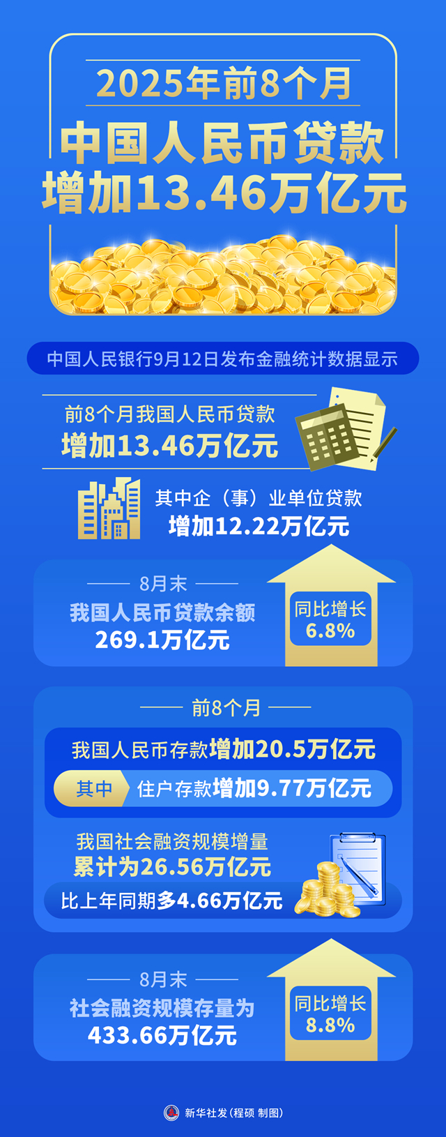 中国人民银行9月12日发布金融统计数据显示,前8个月我国人民币贷款增加13.46万亿元,其中企(事)业单位贷款增加12.22万亿元。新华社发 程硕 制图