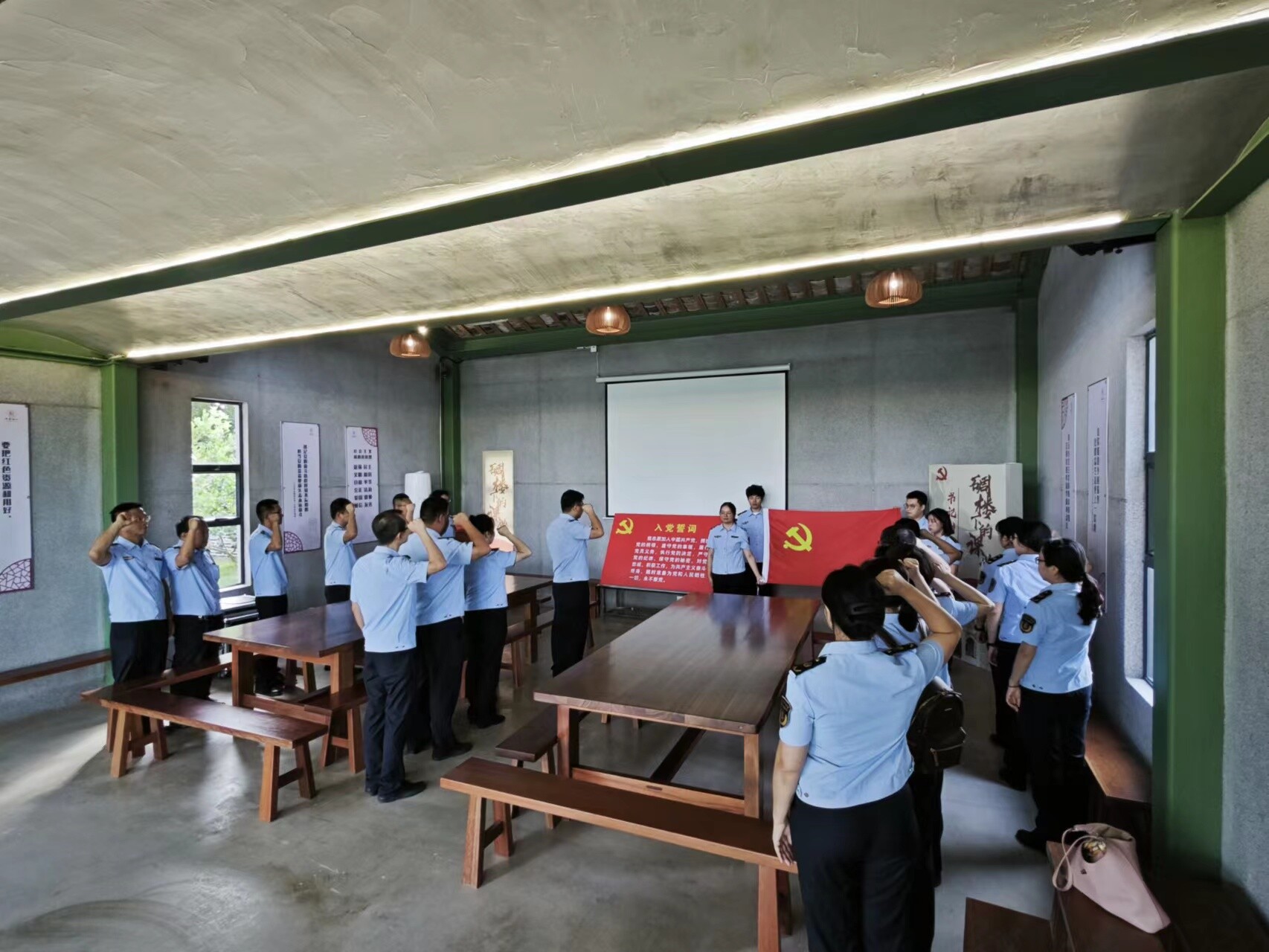 随后,党员们来到碉楼下课堂会议室,在支部书记的带领下,党员们面向鲜红的中国共产党党旗,肃穆站立,举起右拳重温了入党誓词,铿锵有力的宣誓声响彻大厅,表达对党的忠诚和为共产主义奋斗终身的坚定决心。