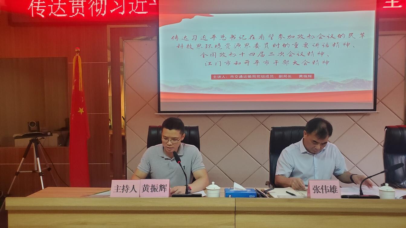 3月25日上午,海棠直播 交通运输局组织召开党组(扩大)会议,传达贯彻习近平总书记在全国两会期间、中央政治局会议上的重要讲话精神和全国两会精神,贯彻落实省、江门和海棠直播 传达贯彻习近平总书记重要讲话精神暨全国两会精神干部大会、十四届全国人大二次会议广东省代表团专题学习会精神以及有关会议精神,学习新修订的《中国共产党巡视工作条例》,研究部署市交通运输局学习宣传贯彻落实意见。市交通运输局领导班子、协管领导,各股室(大队)及下属事业单位负责人参加。
